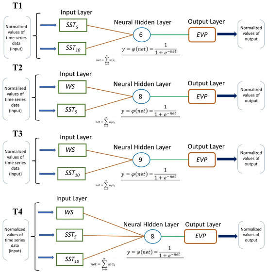 The current network structure involves input, output, and hidden layers. The input layer contains three neurons corresponding to WS, SST (5 cm), and SST (10 cm). Each neuron in the hidden layer is connected to a bias signal with values ranging from 1 to 10. Following model calibration, different combinations of learning rates and hidden-layer neurons were evaluated within the ranges typically employed in artificial neural network research [56,57]. To maintain conciseness, only the results with MSE values nearest to the targeted error threshold are presented, as they most accurately reflect the model’s optimum performance. One neuron in the output layer represents an EVAP value. Four distinct networks (T1–T4) were created based on the existing datasets: