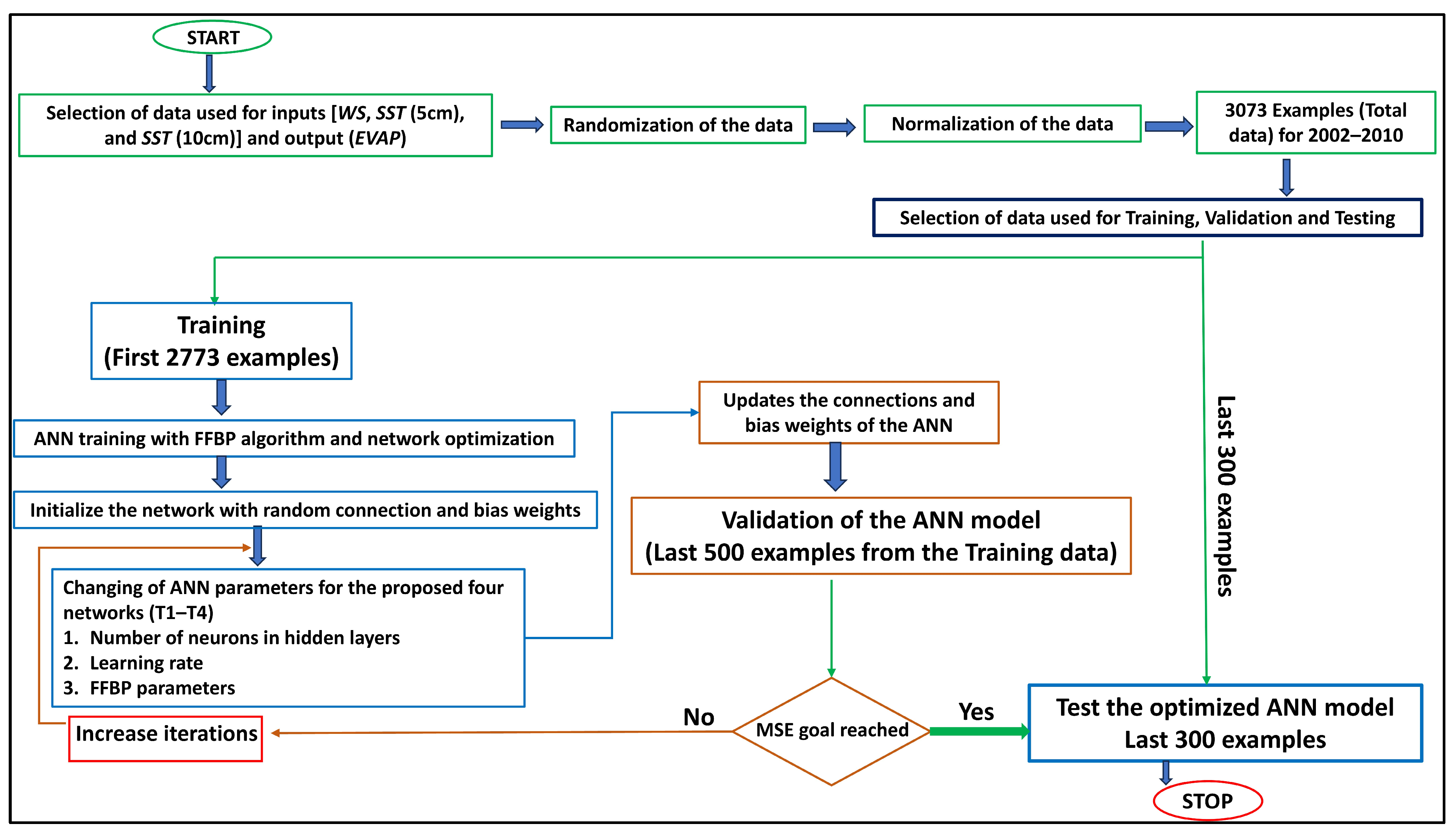 - Refadah, S.S.; Khan, M.Y.A. Artificial neural networks for estimating historical daily missing evaporation to support sustainable development in Saudi Arabia. Phys. Chem. Earth Parts A/B/C 2025, 139, 103949. [Google Scholar] [CrossRef]