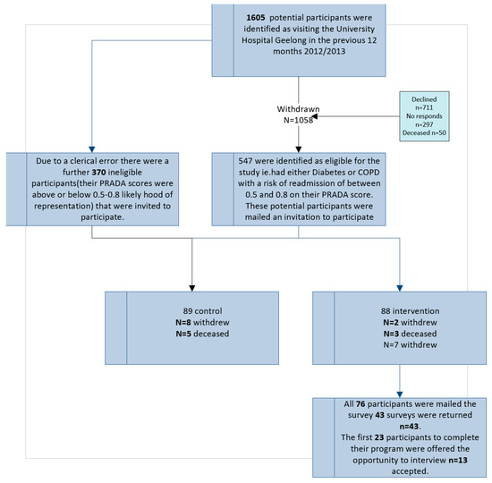 A total of thirteen participants consented to an interview exploring their experience of receiving healthcare using technology in the home. Additionally, forty-one participants completed and returned the survey. Figure 1 presents the participant selection process using an adapted CONSORT flow diagram format, which provides transparent reporting of participant recruitment and selection in mixed-methods research [44]. All participants were enrolled in the Personalised Health Care (PHC) program, referred to as ‘PHC’ throughout the results.