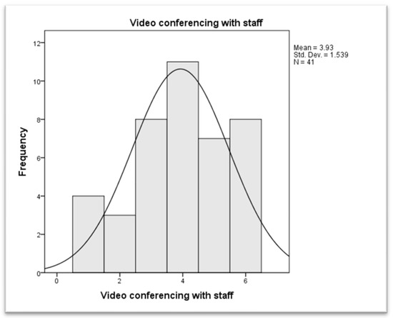 Interestingly, the video conferencing system was not seen as of high importance to the participants, with a broad spread of responses, with some considering it not important at all. Figure 2 shows the histogram for Item one—Video Conferencing with staff.