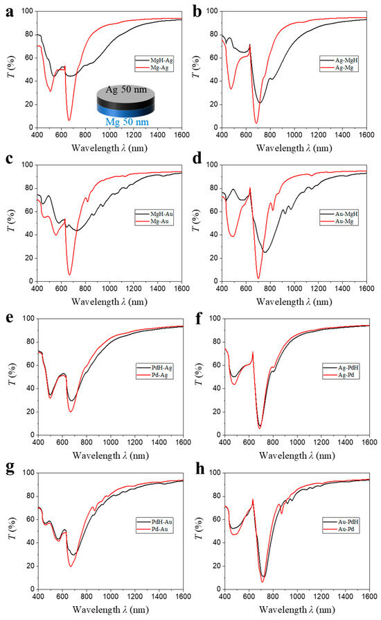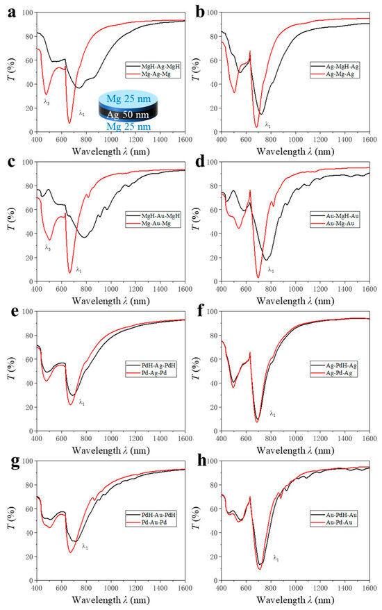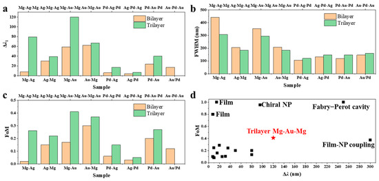Figure 5a). Trilayers with Mg as the central or encapsulating layer, such as Mg-Au-Mg (120 nm) and Mg-Ag-Mg (79 nm), yield the largest resonance shifts. This is attributed to Mg’s metal-to-insulator transition to MgH