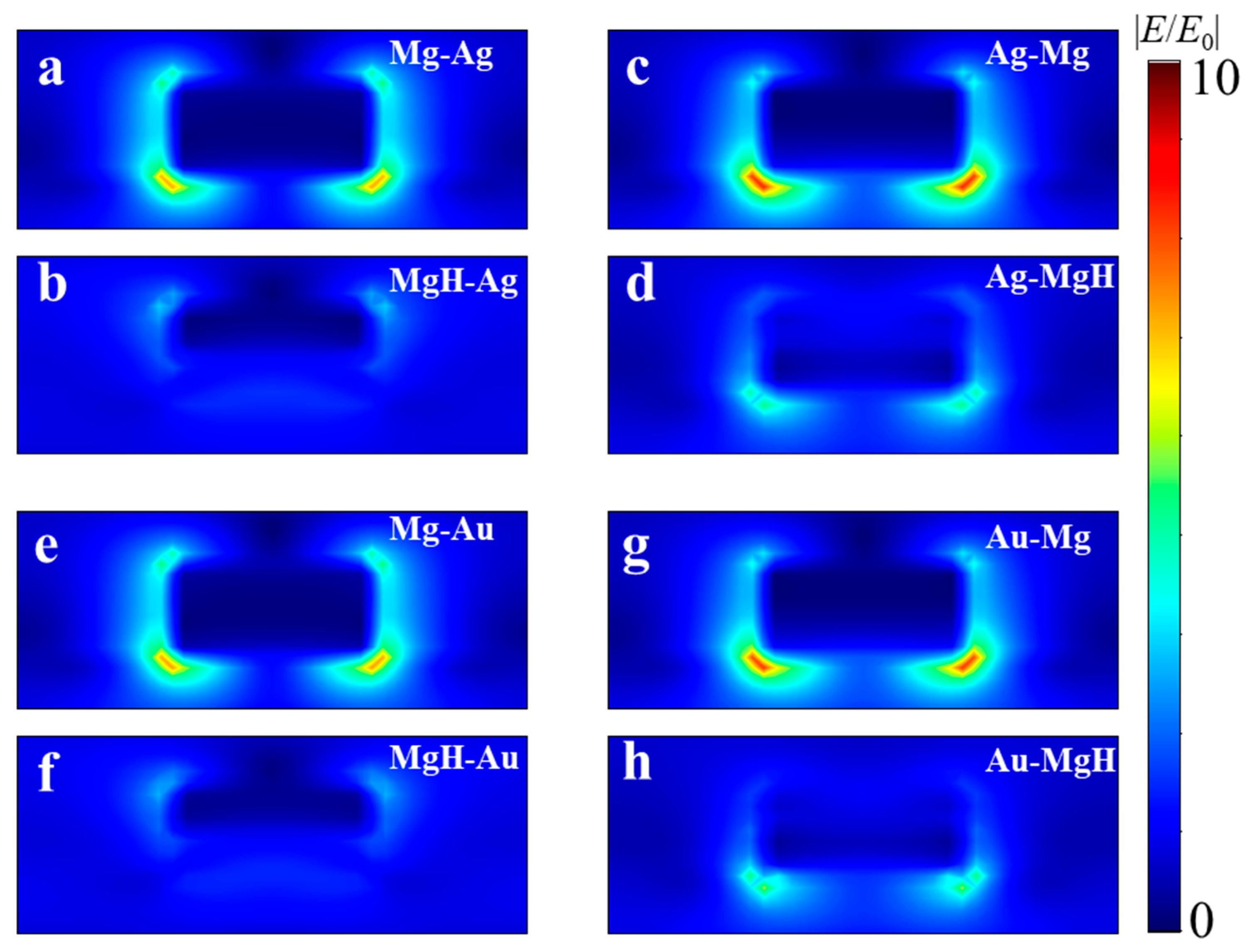 Moreover, the FWHM of the transmission spectra after hydrogenation is markedly reduced for “Mg-on-top” stacks: 206 nm (Ag-Mg) and 207 nm (Au-Mg), compared to 442 nm (Mg-Ag) and 353 nm (Mg-Au). To elucidate the origin of this trend we analyze the numerically calculated electric-field distributions shown in