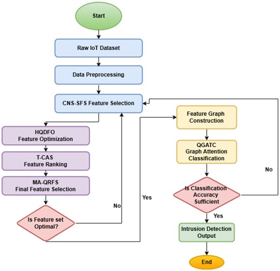 This framework is proposed to be iterative, quantum-driven, and chaos-informed in design to work towards effective feature selection and intrusion detection in IoT networks. As seen in Figure 1, the Chaotic Neuro-Symbolic Swarm Feature Selector (CNS-SFS) aims to enhance feature selection for high-dimensional IoT intrusion detection datasets by bringing chaotic swarm intelligence into a neuro-symbolic reasoning process. Mostly, conventional methods for feature selection become entrapped in local optima thereby limiting global search capability sets. To overcome such limitation, CNS-SFS provides chaotic dynamics into Particle Swarm Optimization (PSO) to cater to feature diversity while the remaining subset is fine-tuned by a neuro-symbolic module under an interpretable logical framework. Given an IoT dataset , each characterized as a feature vector for the process. The initialization of swarm particles follows a chaotic map such as the Logistic Map using (1)