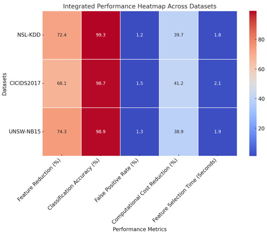 The proposed framework ensures tremendously speedier feature selection compared to other aforementioned counterparts, lowering the execution time by 30–50%. The utilization of chaotic optimization and quantum diffusion principles leads to rapid convergence for feature selection and renders it an efficient tool for real-time applications. Figure 2 and Figure 3 show the model’s integrated heatmap and analysis of the obtained results.