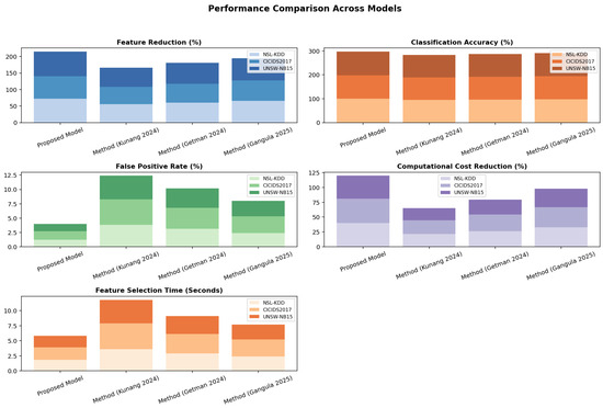 The framework was also compared with the three most contemporary methods that are used in the main field today, which are called Method [5], Method [8], and Method [25], since they are deep learning-based, evolutionary feature selection, and hybrid reinforcement learning methods, respectively. The comparison metrics are classification accuracy, F1 score, feature reduction proportion, false positive rate (FPR), computational efficiency, and feature selection delays.