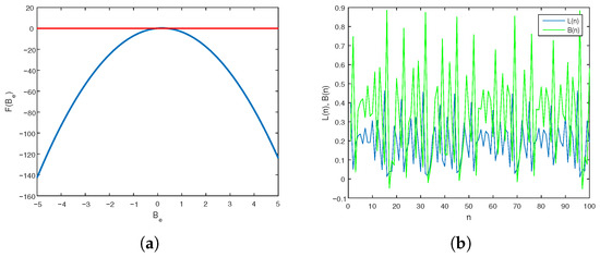 Dynamics of the FDCV model (20) for ; (a) Equilibrium condition given by the nonlinear function ; (b) time series of and emerged from the initial condition .