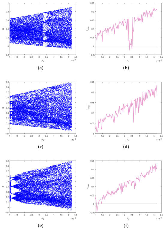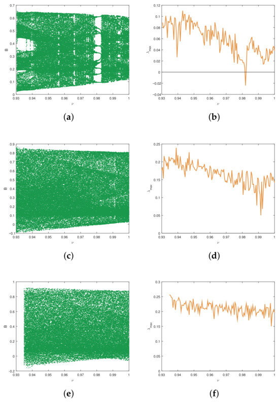 As depicted in Figure 3, the bifurcation diagrams Figure 3a,c,e illustrate the long-term behavior of the state variable B as is varied for , respectively. Concurrently, Figure 3b,d,f present the corresponding Maximum Lyapunov Exponent () plot. For (Figure 3a,b), initially for small values of , the system exhibits chaotic behavior, indicating sensitive dependence on initial conditions. This chaotic behavior is strongly corroborated by the positive values of in Figure 3b. Interestingly, within the chaotic region, there are several periodic windows around , where the system temporarily goes to periodic behavior, identified by narrower bands in the bifurcation diagram and a dip in to negative values. Beyond these windows, chaos re-emerges and persists for larger values, with remaining predominantly positive, signifying robust chaotic dynamics. A similar progression is observed for (Figure 3c,d) and (Figure 3e,f). While the specific onset points and widths of chaotic and periodic windows may vary slightly with , the overall qualitative behavior remains consistent: an initial periodic phase, followed by period-doubling leading to chaos, punctuated by periodic windows, and finally sustained chaos as increases. The positive values consistently confirm the presence of chaos in the regions of the bifurcation diagrams, while negative values align with the periodic windows. Notably, the overall range of chaotic behavior appears to broaden as approaches 1, indicating that higher fractional orders might promote more sustained chaotic dynamics under these parameter settings. In some simulations, small negative values of occur. These should be regarded as numerical artifacts of the discretization rather than physically meaningful outcomes. It is worth noting that the coefficients of the fractional sum are positive for . Hence, when all parameters and initial conditions are nonnegative, the analytical solution preserves nonnegativity in the absence of numerical errors. The small negative oscillations observed in are therefore attributed to round-off effects rather than to a violation of the model’s invariance properties. Developing positivity-preserving schemes for fractional discrete systems will be an important subject of future work.