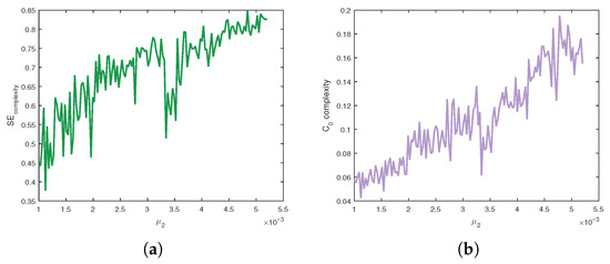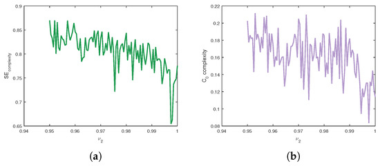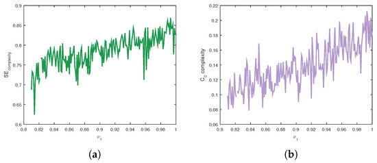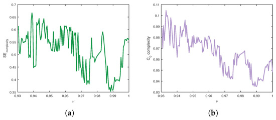 SE and complexity of the FDCV model (20) for . (a) Spectral Entropy (SE), (b) complexity.