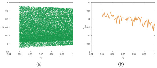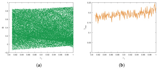 Next, we study the influence of the fractional order , which captures the memory effect inherent in the system. We assess how the memory strength affects the system’s evolution. To illustrate this effect, we fix all other parameters at and , and consider different values of while varying in the interval . The bifurcation diagrams and maximal Lyapunov exponent () plots reveal how the system’s behavior changes with the fractional order. For , the system exhibits both chaotic and ordered behaviors as is varied. The bifurcation diagram in Figure 6a shows that the system starts in a chaotic state for and undergoes several transitions, with a distinct periodic window emerging around . The corresponding plot in Figure 6b confirms this, with positive values in the chaotic regions and a clear drop to negative values in the periodic window, indicating a stable, ordered state. When the parameter is increased to , the system’s dynamics become robustly chaotic. As seen in the bifurcation diagram in Figure 6c, the system remains chaotic across the entire range of from to 1, with no clear periodic windows. This is supported by the plot in Figure 6d, which shows consistently positive values throughout the interval, confirming the persistent chaotic nature of the dynamics. For this value of , the system also appears to be entirely chaotic. The bifurcation diagram in Figure 6e shows a dense distribution of points with no visible periodic windows. The corresponding plot in Figure 6f is consistently positive, reinforcing the conclusion that the system remains chaotic across the entire range of from to 1. The analysis of Figure 6 demonstrates that the fractional order can act as a bifurcation parameter for the FDCV model (20), inducing transitions between chaos and order, particularly for smaller values of . However, as increases, its influence on the system’s dynamics appears to dominate, leading to a consistently chaotic state that is robust against variations in the fractional order.