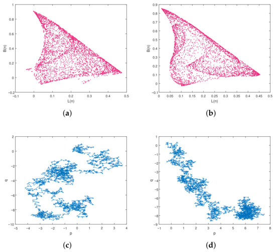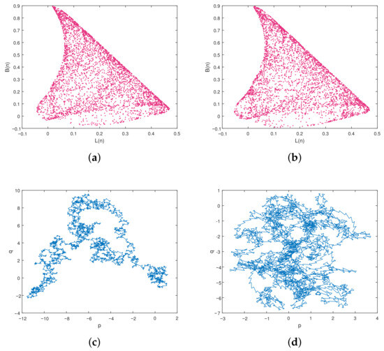 Figure 13 illustrates phase portraits (a, b) and the 0–1 chaos test (c, d) of the incommensurate FDCV model (31) for two representative values of with . The phase portraits reveal irregular and non-periodic attractors, with in Figure 13a producing a denser structure compared to in Figure 13b, reflecting stronger chaotic mixing in the fractional-order case. The 0–1 test outputs (c, d) further validate chaotic dynamics: the trajectories in the (p,q)-plane spread out randomly for both values, with no bounded repetitive pattern. This provides numerical confirmation that the FDCV system (31) maintains chaotic behavior in both cases, though the structure is visibly richer at fractional orders.