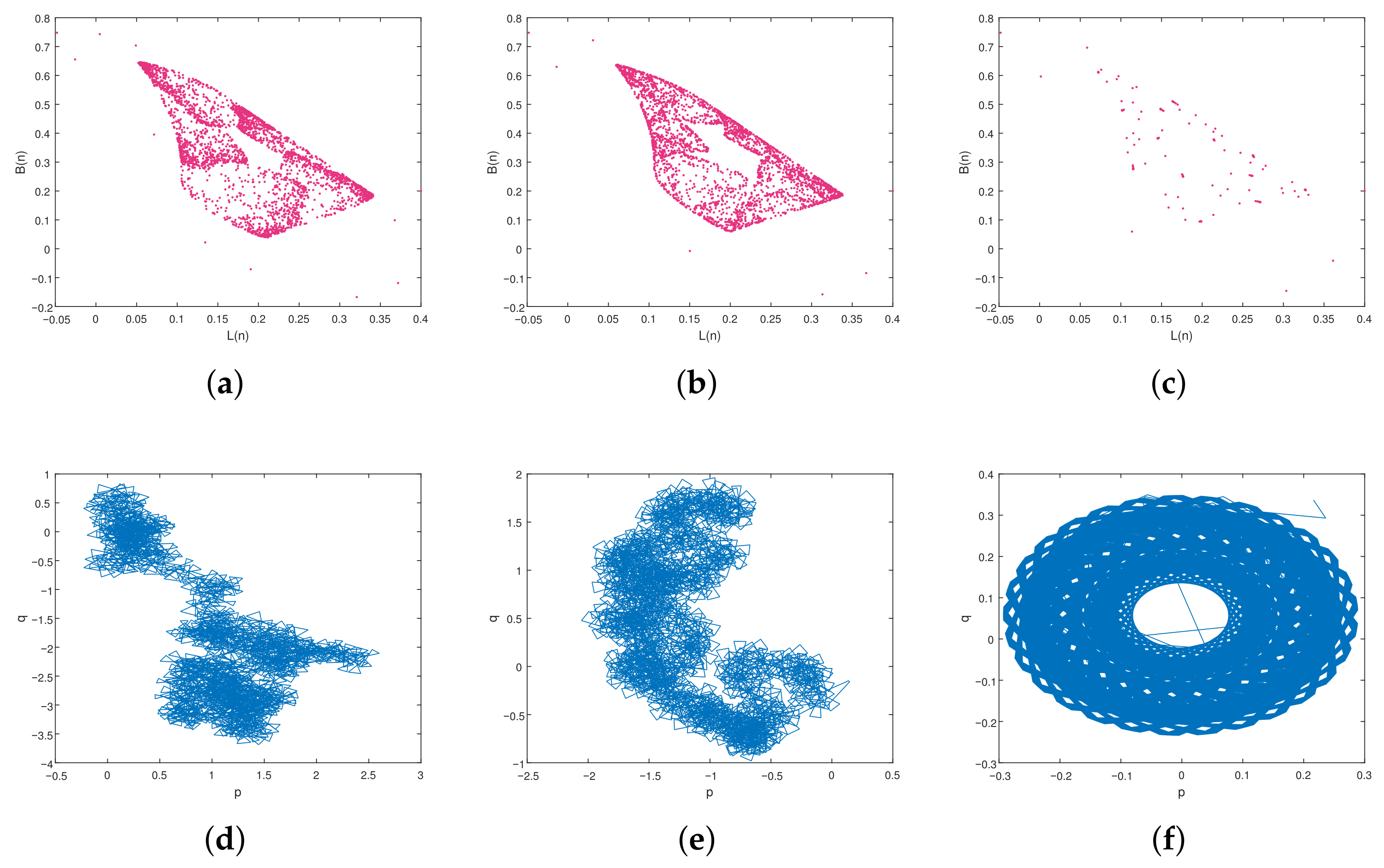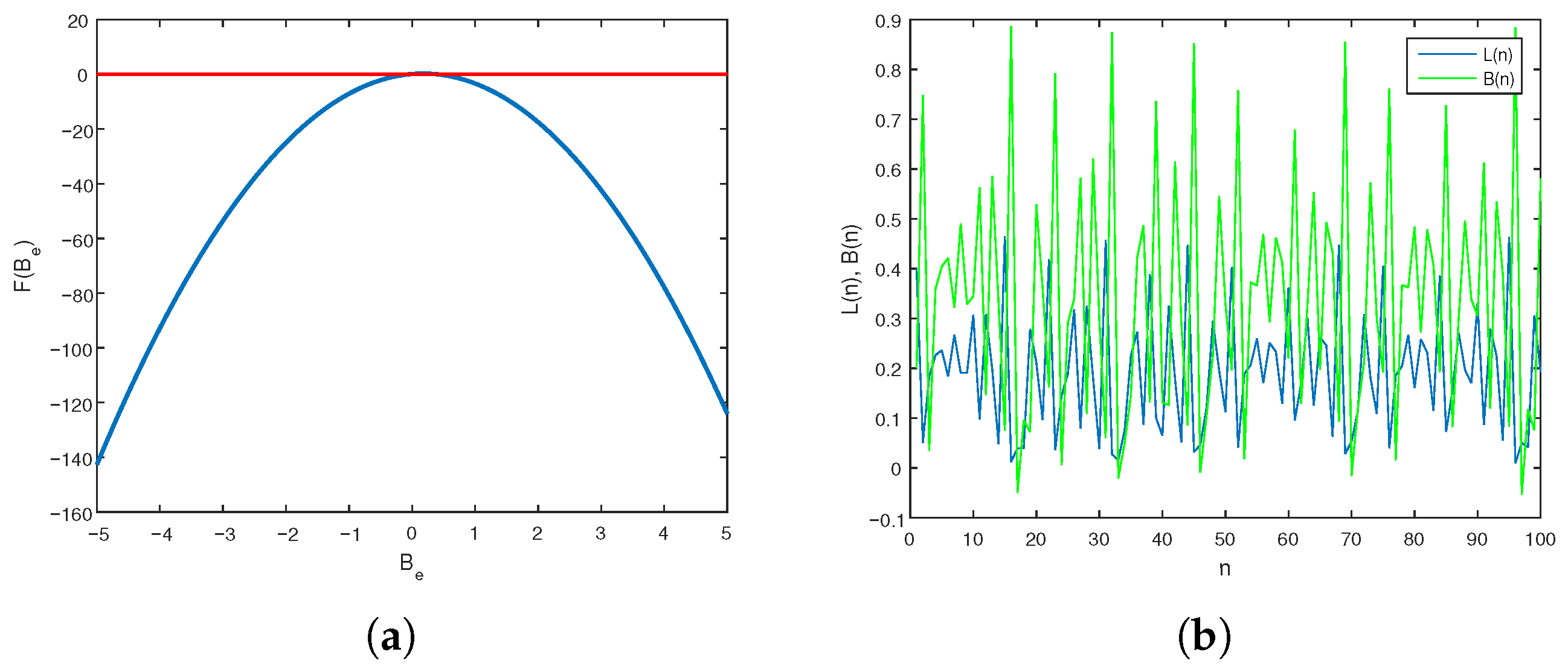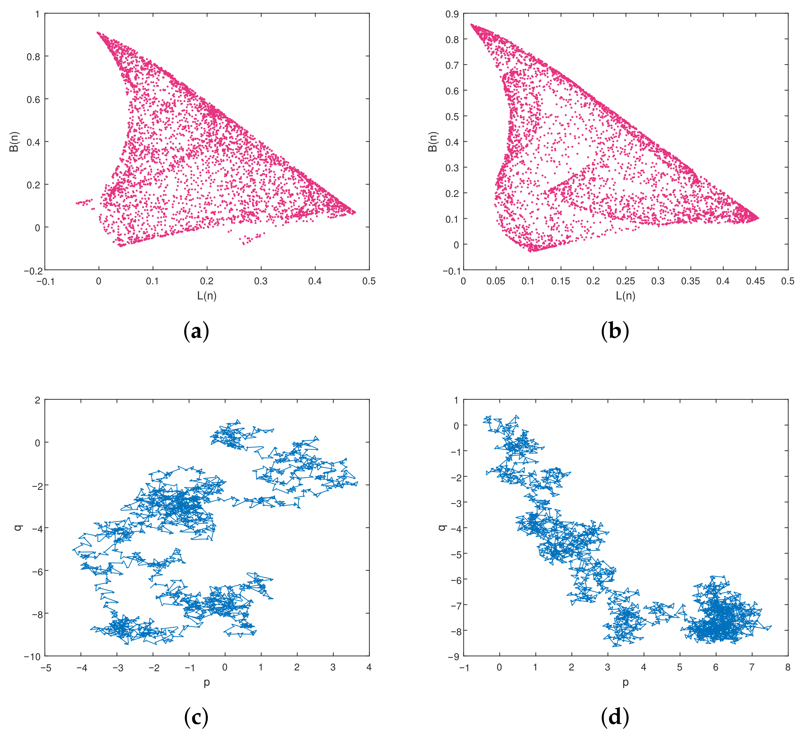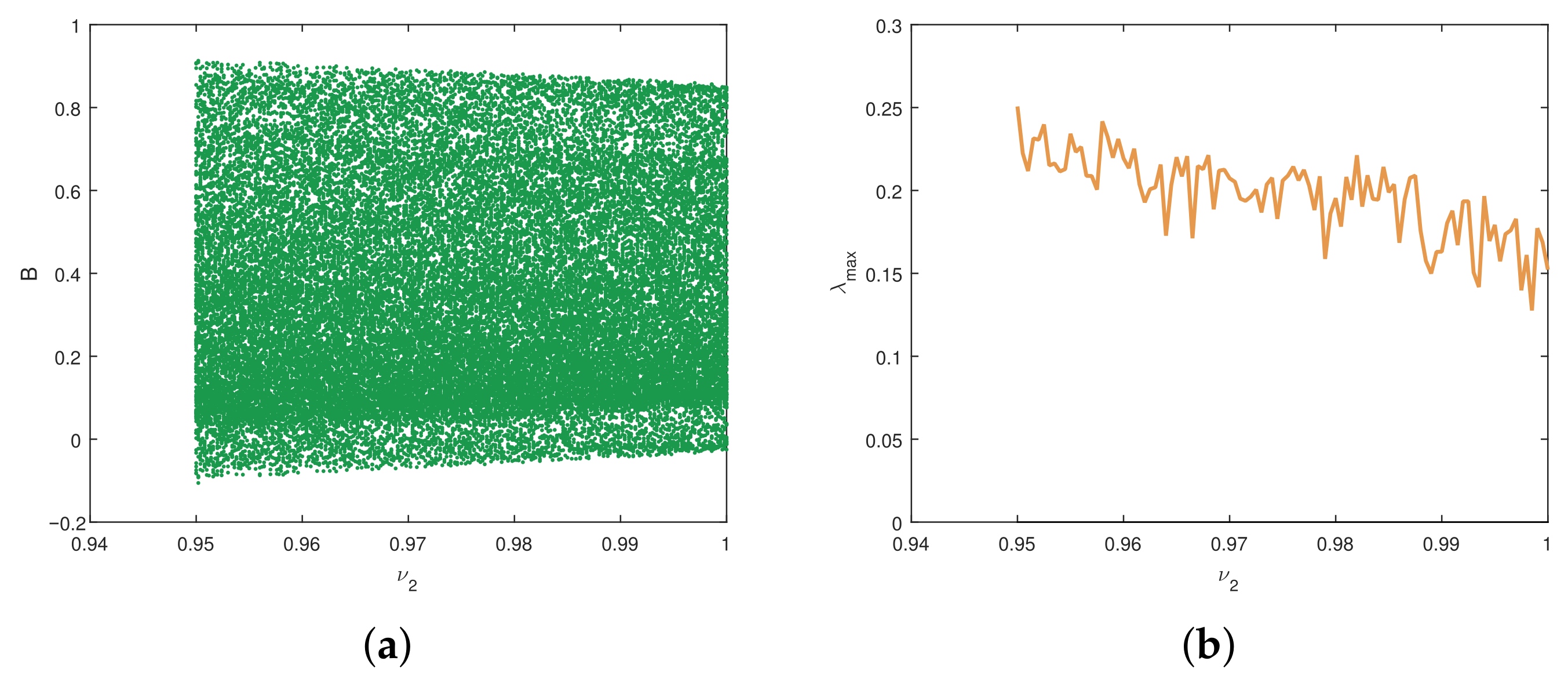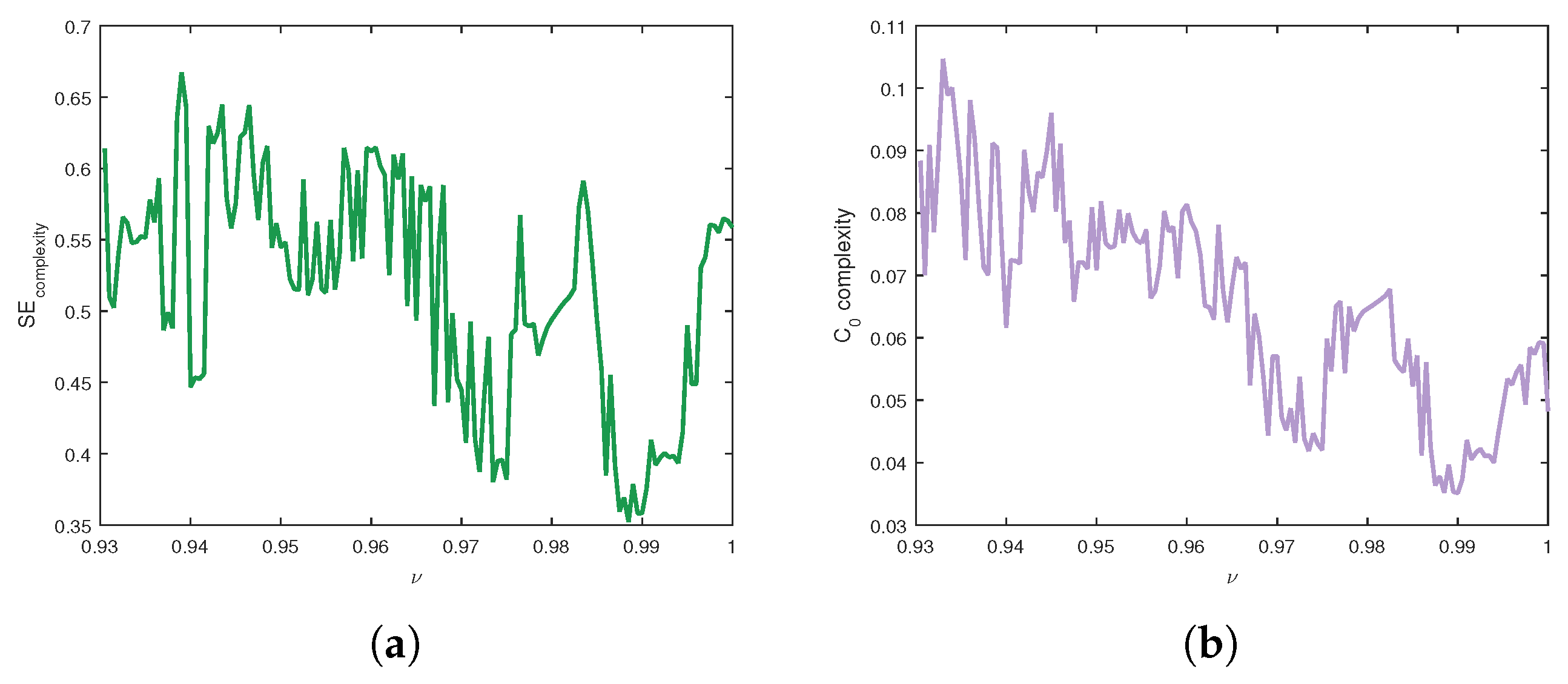 - 0–1 Test for Chaos: [20] This binary diagnostic tool is used to distinguish between regular and chaotic dynamics. For a given time series , the test constructs the following trajectories: