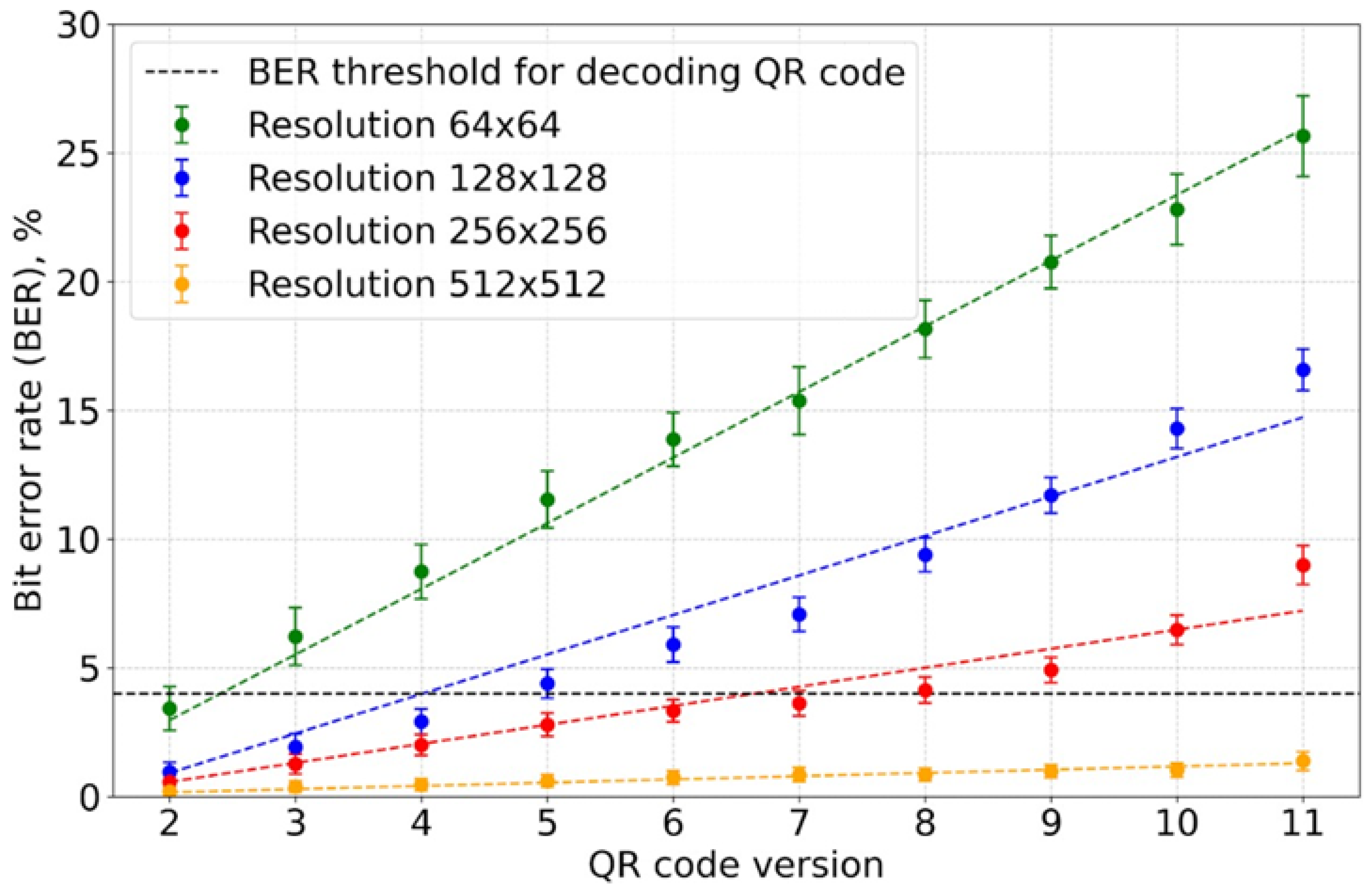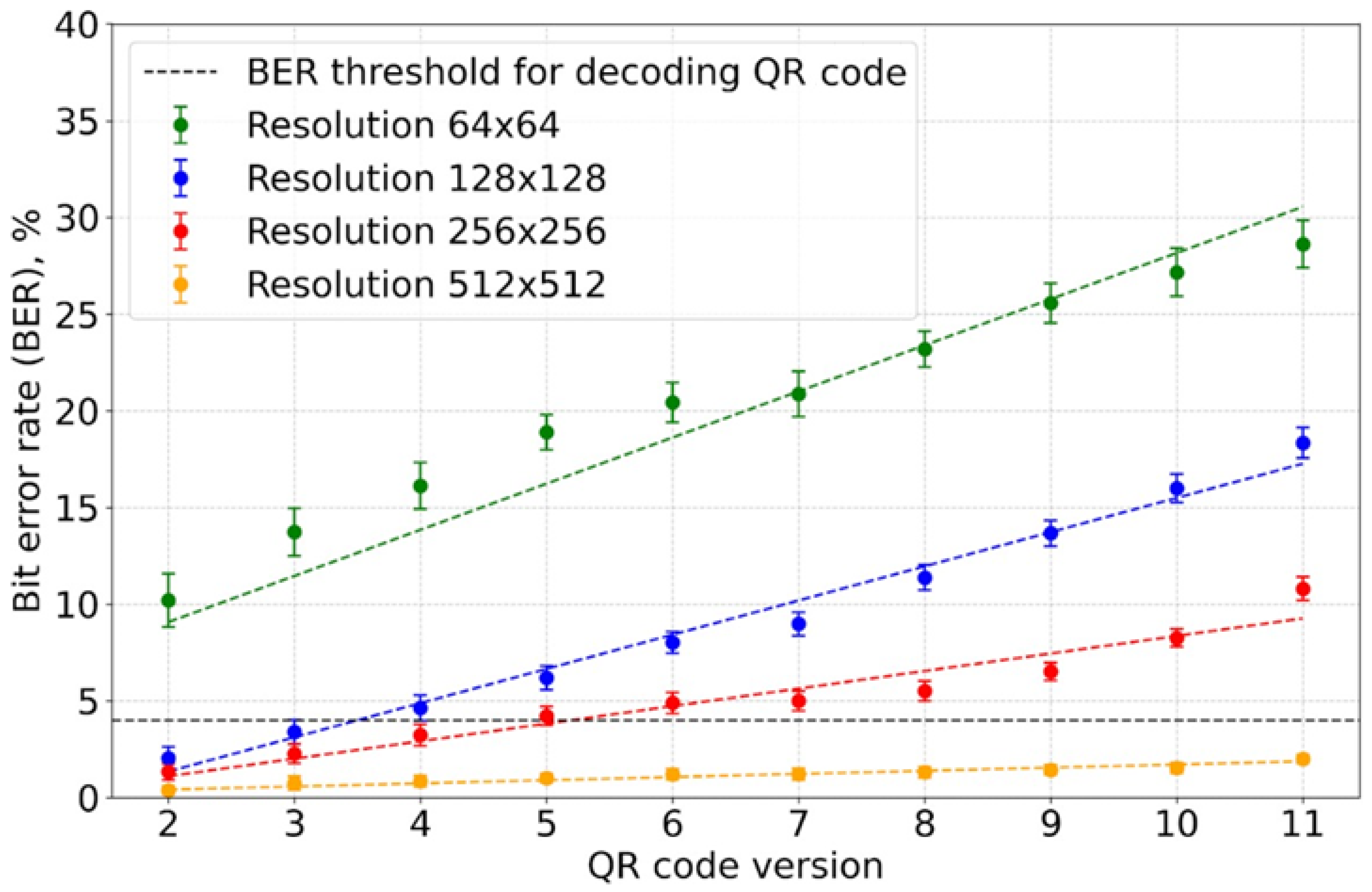 - The BER values increased linearly with the QR code version.