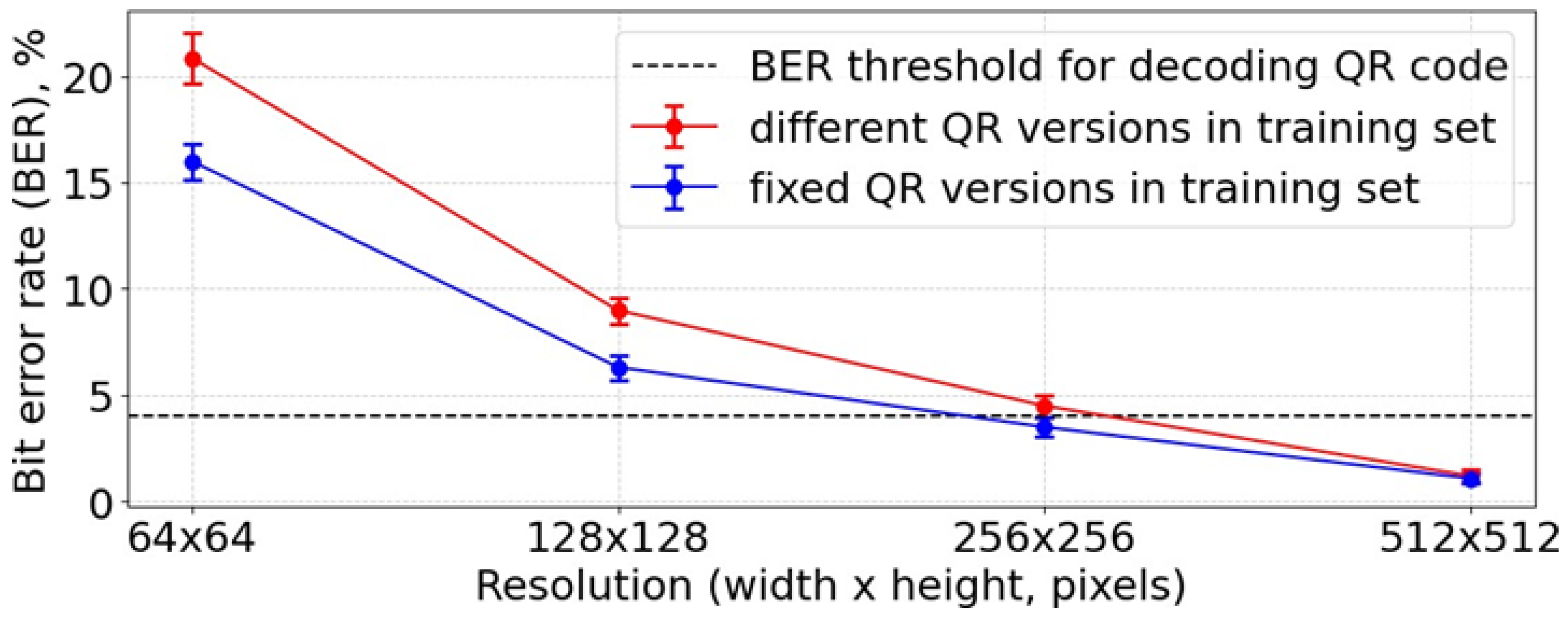 - The BER values decreased exponentially with the increase in QR code resolution.