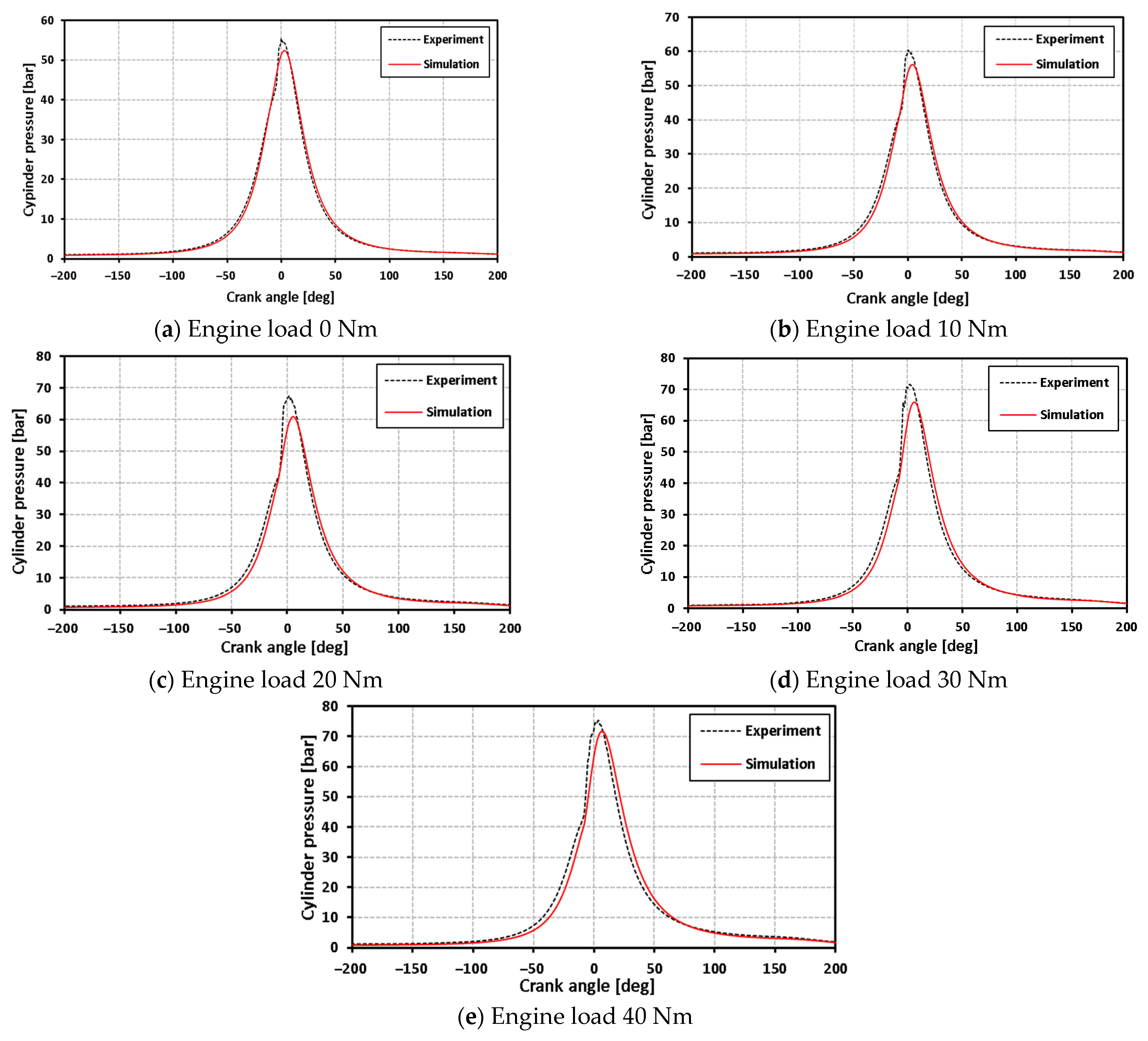 The base model was built on one-dimensional combustion software by AVL Boost, and the results are validated by comparing them with the experimental results. The comparison of the pressure in the combustion chamber from the simulation and experiment for diesel fuel with a specific load is shown in