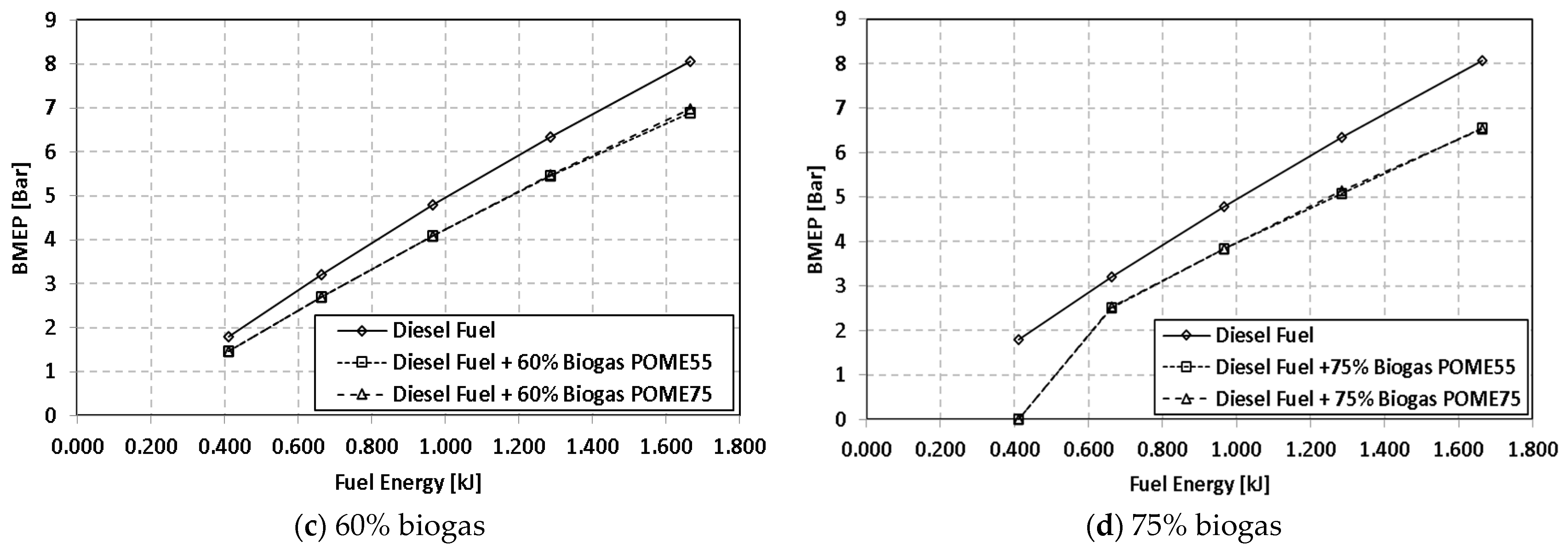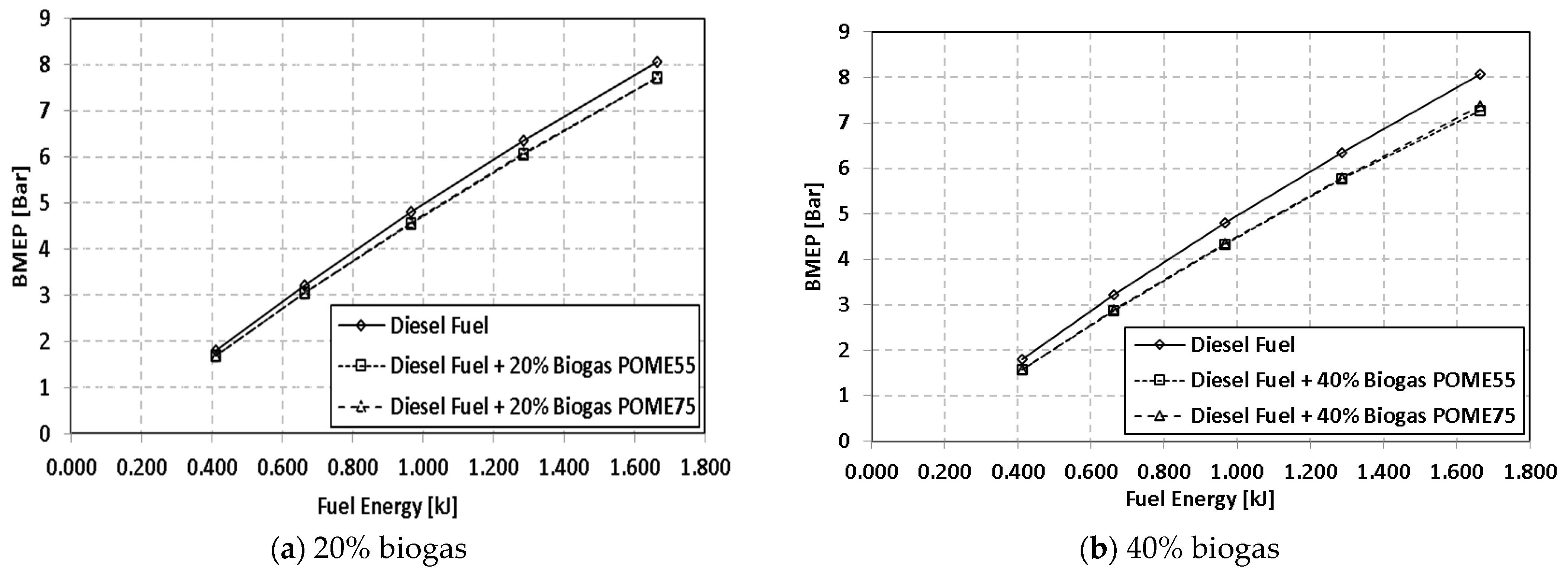 The reduction in the BMEP trend might be happening due to the lowest energy source being input to the piston cylinder, which was then compressed and combusted in the combustion chamber. Biogas from POME is a fuel-based gas; the characteristic of fuel-based gas is lower energy density than liquid fuel. Since the parameter on the modeling process is restricted to the cylinder volume boundary, the energy content of fuel substituted for the combustion process becomes a major parameter of the base energy being taken.