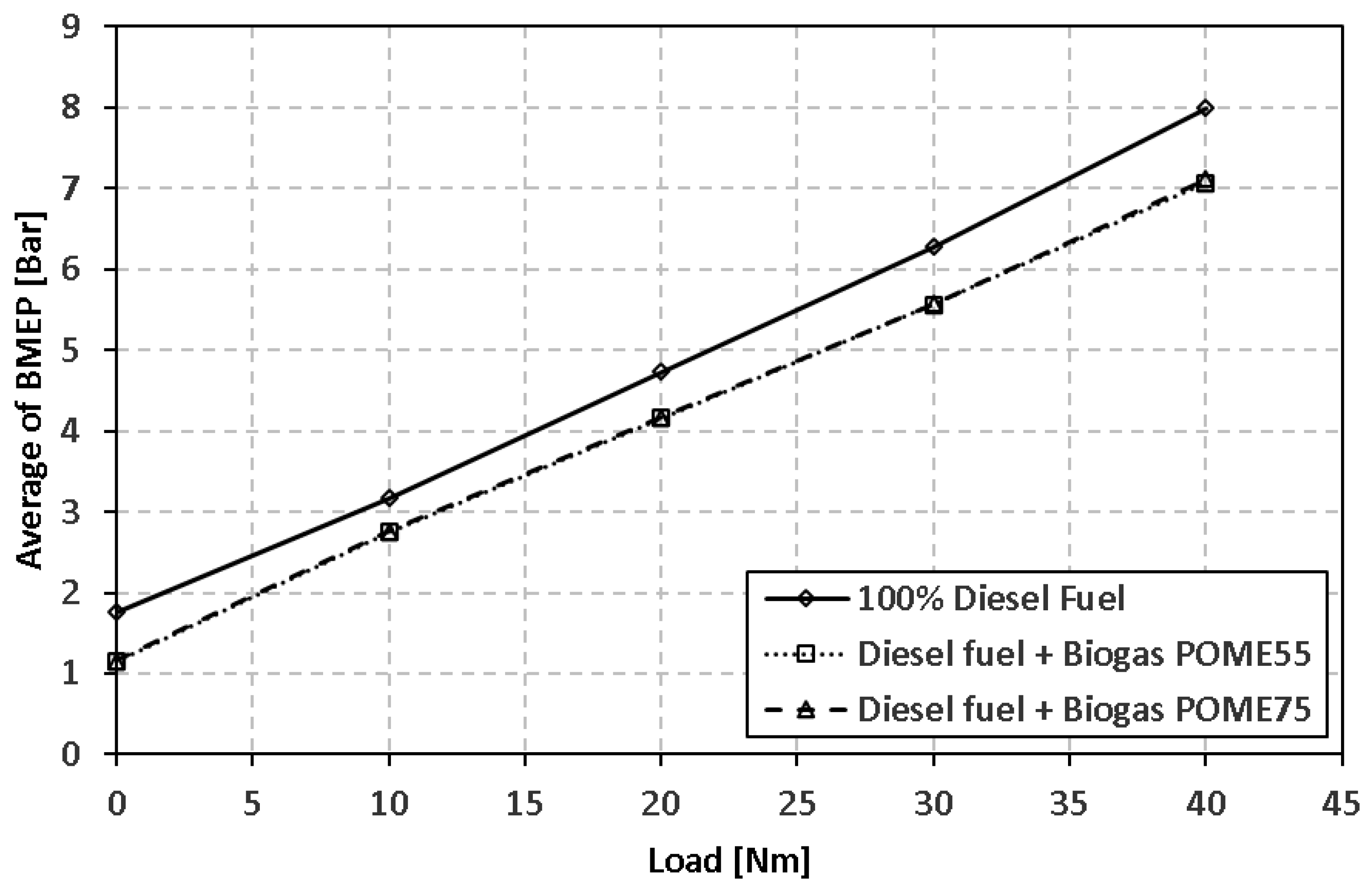Figure 4. The utilization of biogas POME as a substitution fuel for the diesel dual-fuel engine will decrease the BMEP value. The BMEP value will decrease gradually until it reaches the critical point of the engine, which causes the engine to not be able to work because the amount of energy from the fuel is not able to provide enough pressure in the combustion chamber to push the piston and then rotate the crankshaft. The composition of biogas from POME (POME55 and POME75) does not have any significant impact on BMEP, as shown in
