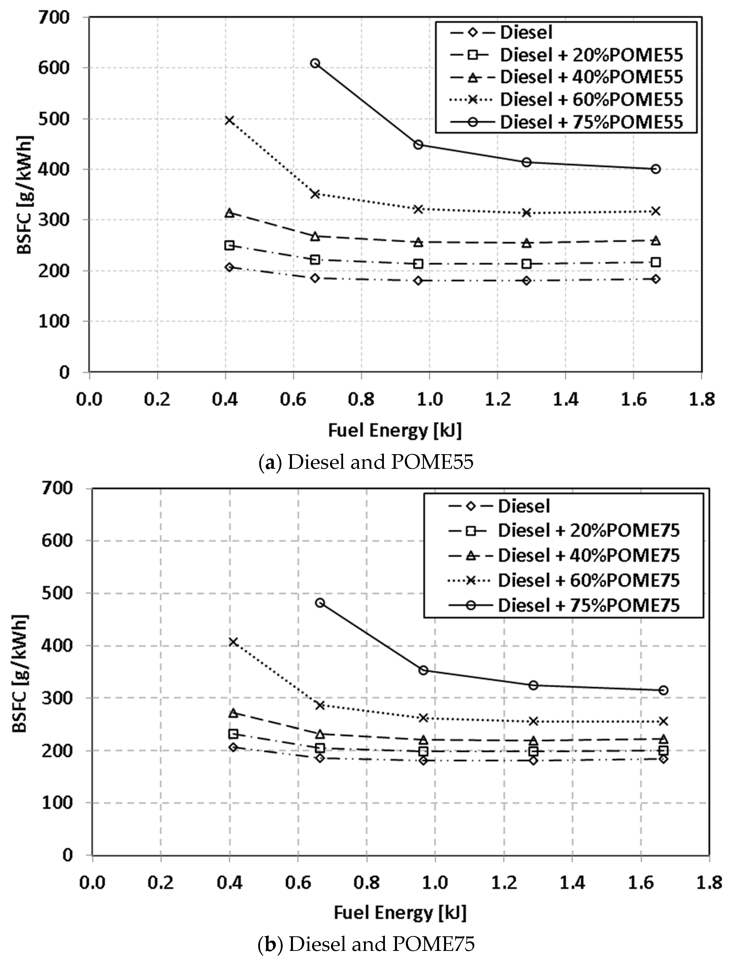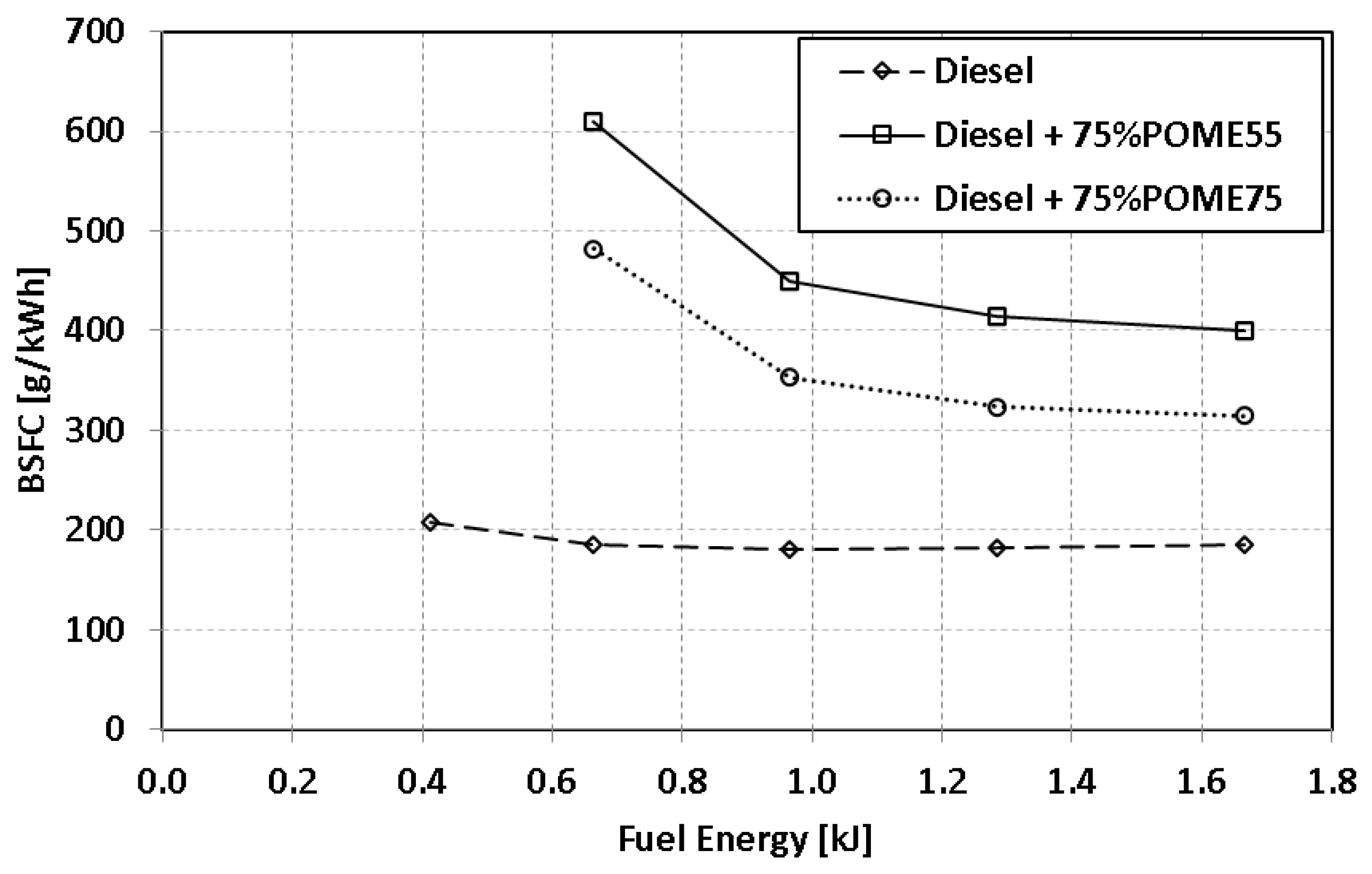 Table 8, the decreases in BMEP, effective efficiency, and diesel fuel consumption tend to be the same in each variation; hence, a deeper review was carried out on other parameters, namely BSFC and emissions. The BSFC increase of POME55 tends to be higher than that of POME75. This indicates that the use of POME55 is more fuel-intensive.