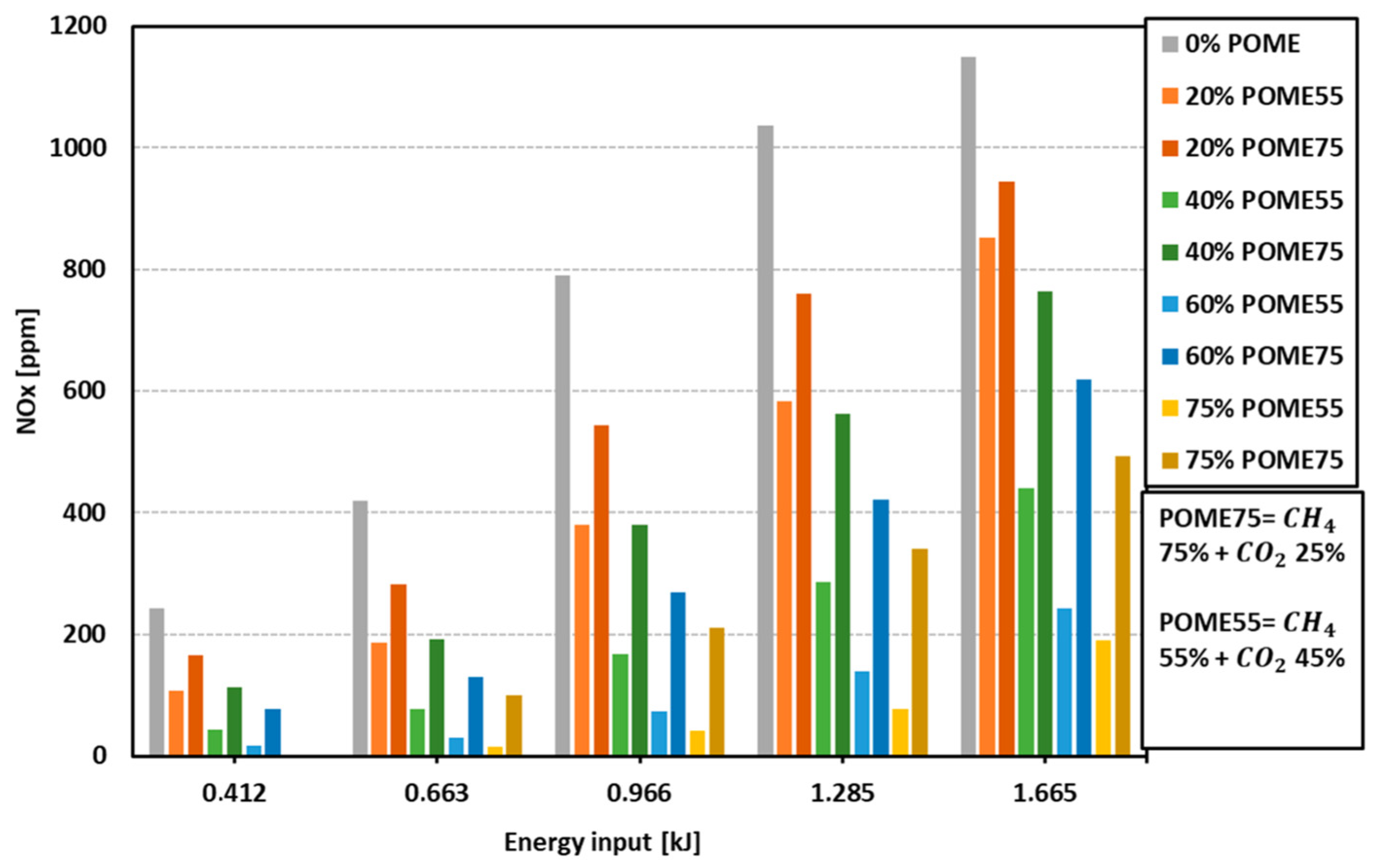 Therefore, although the use of 60% and 75% of biogas results in very good emission reductions, a deeper review will only be carried out on the use of biogas energy ratios at 20% and 40%. In terms of NOx emissions, POME55 shows a fairly high reduction, that is 75% (at 40% POME). While at 40% POME75, the reduction in NOx emissions is only 43%. However, the soot reduction on POME55 was not very high, only 27%, while on POME75 it was 41%. It should also be noted that at POME55, with an input energy of 1.665 kJ, the emission of soot increased by 29%. Whereas in general, the resulting soot should be reduced. Therefore, the use of POME75 is recommended. Furthermore, between 20% and 40% biogas energy ratio, the use of a 40% biogas energy ratio is preferable. Overall, the resulting emissions can be reduced by almost half (40–50%). The optimum for dual-fuel engine operation is the 40% of biogas POME75 variation.
