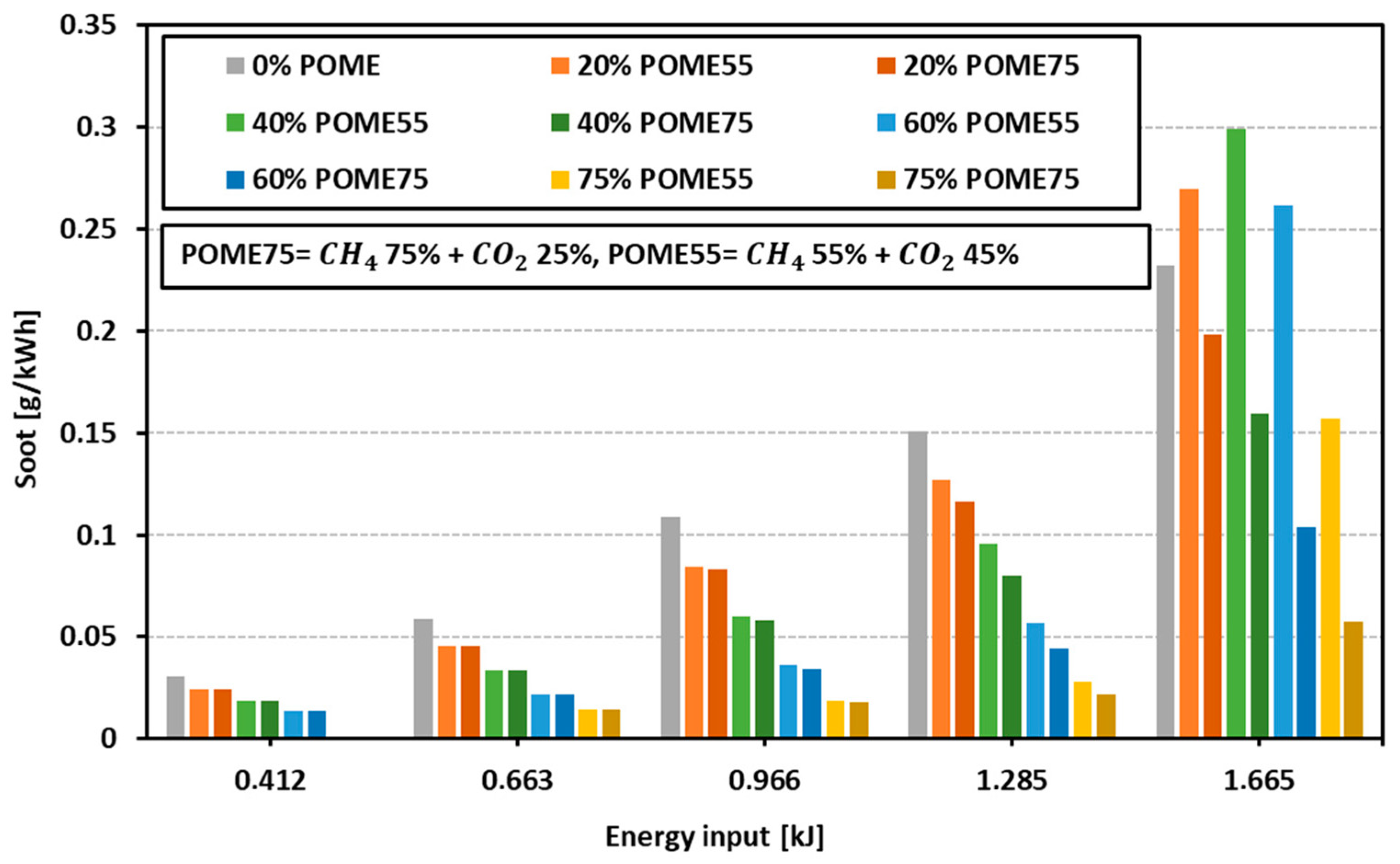 Figure 9 shows that the emission of soot tends to be stable until the input of fuel energy is about 1.665 kJ. Overall, the addition of biogas POME can reduce soot emissions, especially at high biogas energy ratios. However, at a fuel energy of 1.665 kJ, the utilization of POME55 tends to increase the resulting soot (except at 75% POME). The highest percentage of soot reduction was achieved with the 25% diesel–75% POME75, which was 79.99%.