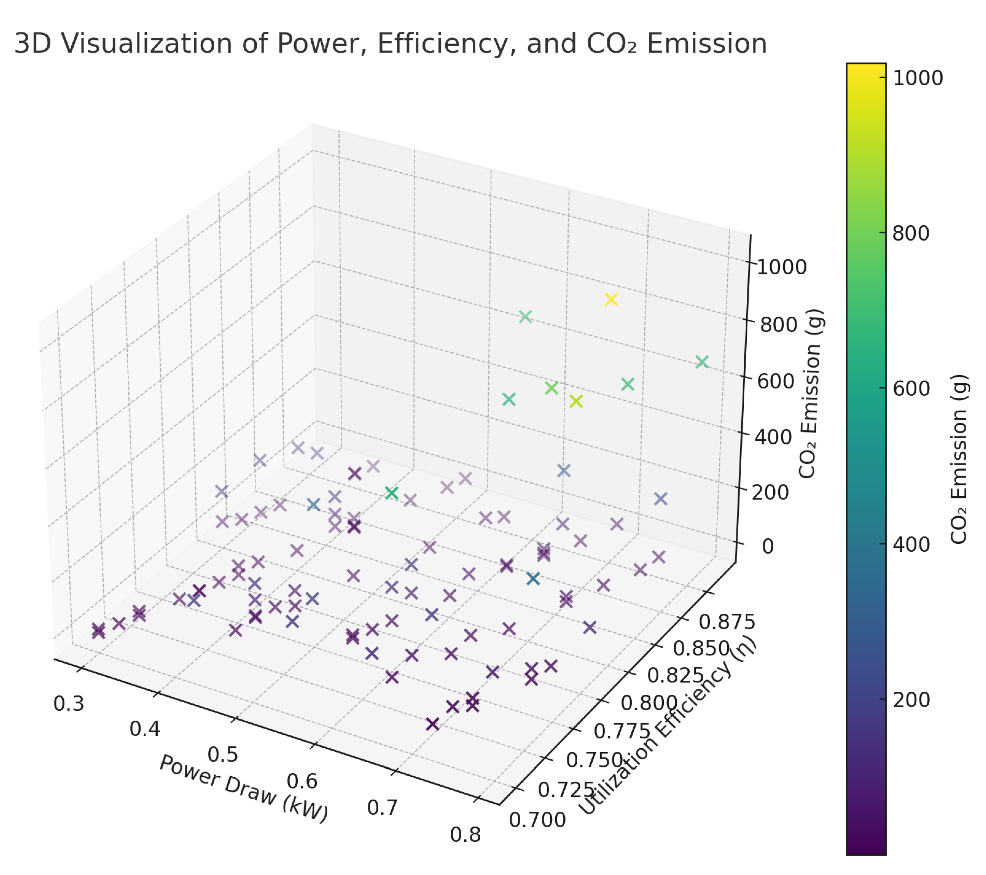 3D scatter of power draw (kW), utilization efficiency (), and emissions (g). High power with low yields the largest emissions; moderate power with higher forms low- clusters.