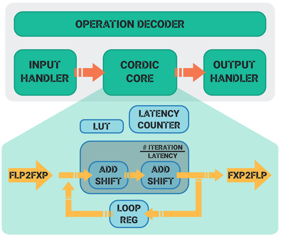 Figure 3 shows the architecture of TOXOS. The Input Handler dispatches the input data to the right input port of the CORDIC unit and sets the and m parameters in (1), (), and () according to the function to be computed. The FLP2FXP module converts the input data from floating-point to fixed-point representation. The Latency Counter keeps track of the number of iterations of the CORDIC algorithm, then (6) instances of add and shift units are used for the computation. iterations are performed, and the result is sent to the FXP2FLP module, which converts the fixed-point result to the floating-point representation. Then, the result is sent to the Output Handler, which reads the result and sends it to the output port.
