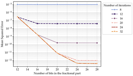 As the number of iterations and the input latency are two independent parameters, one can increase the accuracy of the overall computation while paying little or almost no hardware cost. For example, assuming a fixed fractional representation of the values (24 bits), and the number of internal add and shift units is kept constant (Figure 3), for example to four, it is sufficient to add two latency cycles to reduce the MSE by 100 times while increasing the number of CORDIC iterations from 16 to 24 (purple to pink line in Figure 4) at almost no hardware cost. As highlighted in Table 4, two more clock cycles are not a big issue compared to the software-only execution.