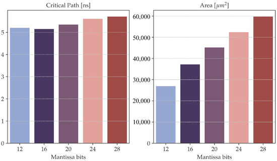 As expected, the area and critical path length depend almost linearly on the width of the mantissa part of the fixed-point representation. The bar plots in Figure 6 visually report this correlation for a configuration with 20 iterations and a latency of 4 cycles. In the case of 16 mantissa bits, the critical path is shorter since the synthesizer selected a different architecture for the adders in the internal stage. While the increase in area and latency is justified when the number of bits in the mantissa is lower than 24, since the MSE is reduced (as shown in Figure 4), when incrementing the number of bits in the mantissa, the error is not reducing, so the increase in area and latency is not justified. In fact, the MSE is bounded by the accuracy of the mantissa of the floating-point representation, which is 24 bits in single precision.