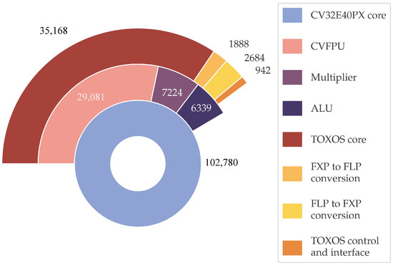 Figure 7 reports the area breakdown of TR-HEEP. As expected, the largest component is the actual cordic unit, which occupies 85% of the total TOXOS area. The area occupied by the CORDIC unit mainly depends on the selected parameters, such as the number of iterations and the latency. Meanwhile, the converters from floating- to fixed-point and vice versa occupy 4.5% and 6.5% of the total area, respectively. The control and interfacing logic occupy only 4% of the total area, so the overhead of interfacing TOXOS with the CV32E40PX core is minimal.