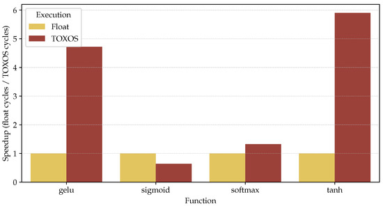The results are reported in Figure 8. TOXOS outperforms the CPU in the computation of gelu and tanh, presenting a speedup of and , respectively. While the execution of sigmoid is slower than the CPU, as reported in Section 6.2, it was not possible to use the floating-point registers of the CV32E40PX core to pass the input and output of TOXOS, so the input and output of the function are stored in the general-purpose registers, which requires movement between the floating-point and the general-purpose register file to add the 1 in the denominator. For the softmax function, performance is similar to the CPU, since the main bottleneck is the computation of the elementwise division of the input vector for the sum of the exponentials, which is not supported by TOXOS.