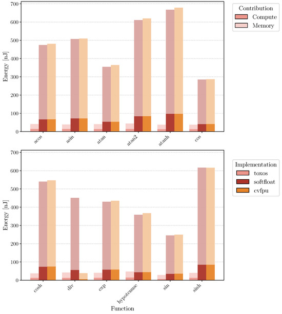 Figure 10 reports the energy consumption of TOXOS, CVFPU, and softfloat for the computation of the different CORDIC-supported functions. The results show that TOXOS is significantly more energy efficient than both CVFPU and softfloat for all operations. The energy contribution of the memory is significantly reduced using TOXOS, since the number of instructions executed, and thus fetched from memory, is lower.
