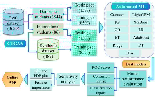 In this study, advanced ML and CTGAN techniques were applied to evaluate and predict undergraduate dropout risks, aiming to reveal the complex relationships between various factors and the outcome, as well as to develop a predictive tool. The workflow for conducting the ML research is depicted in Figure 1.