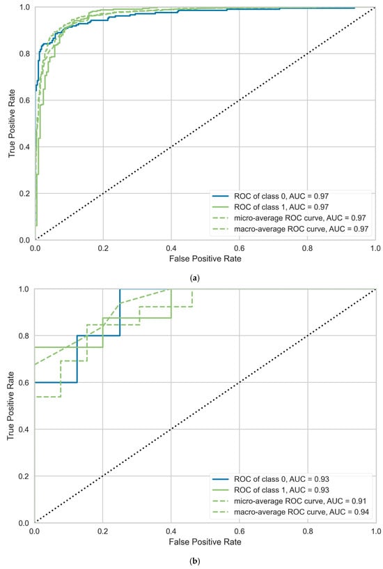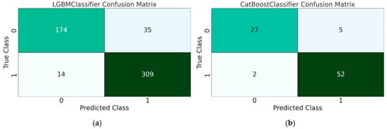 The performance of the LightGBM and CatBoost models was thoroughly evaluated to assess their prediction accuracy and provide insights for future research applications. The evaluation employed several visualization tools, including AUC plots, confusion matrices, and classification report heatmaps. Figure 5 illustrates the AUC curves for both domestic and international students, where the classes are numbered 0 and 1.