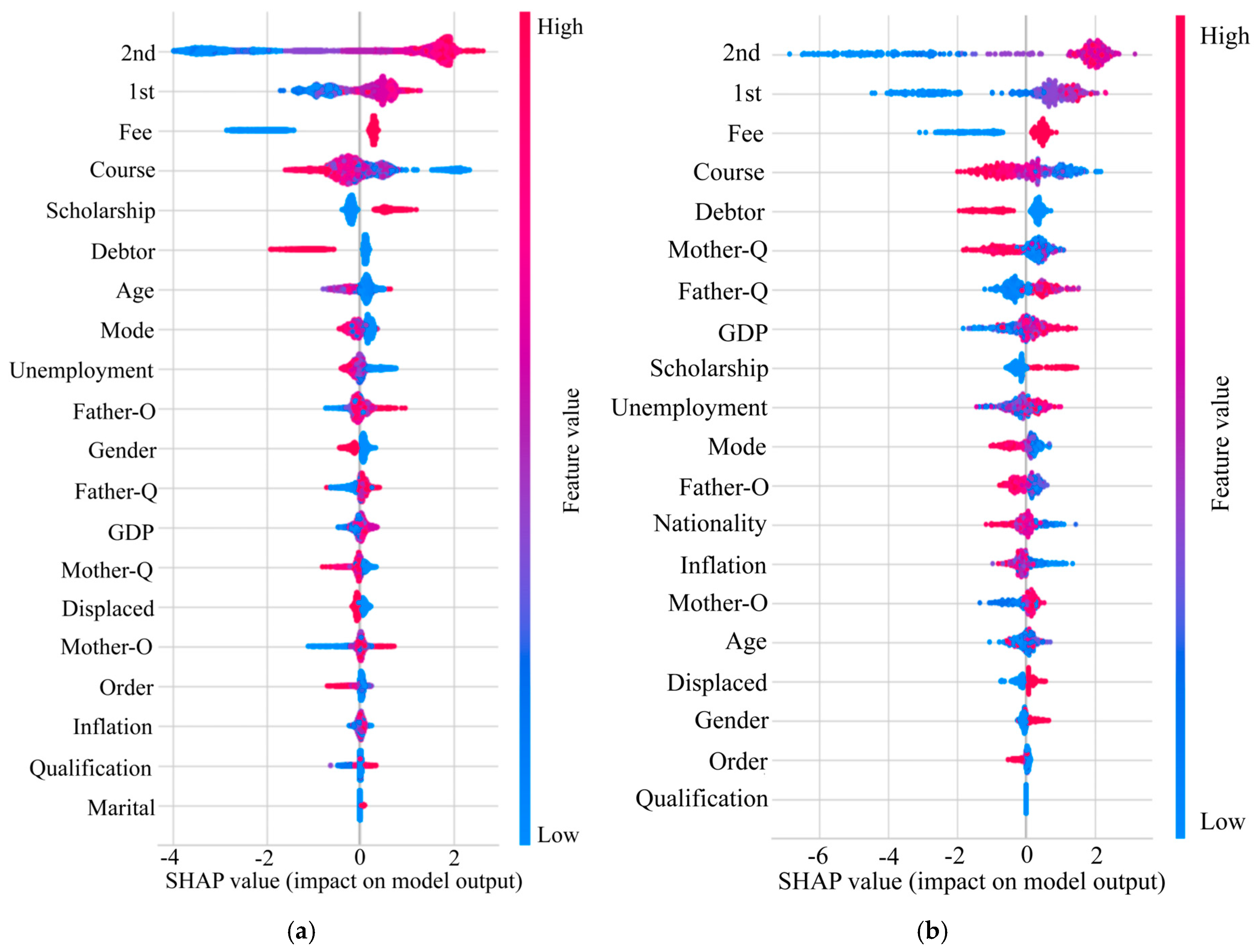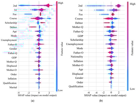 SHAP values provide a detailed interpretation of feature importance, quantifying both the direction and magnitude of each variable’s influence on the model’s predictions. As illustrated in Figure 8, a color gradient ranging from blue to red represents the spectrum of SHAP values from lowest to highest, with each point corresponding to an individual observation within the dataset. The analysis reveals that subjective academic performance (the number of courses passed) is the primary determinant of undergraduate dropout risk. Notably, courses passed in the second semester (2nd) exert the strongest influence; higher pass rates correlate with significantly increased SHAP values, indicating a substantially greater likelihood of graduation. A similar, though slightly less pronounced, trend is observed for courses passed in the first semester (1st).