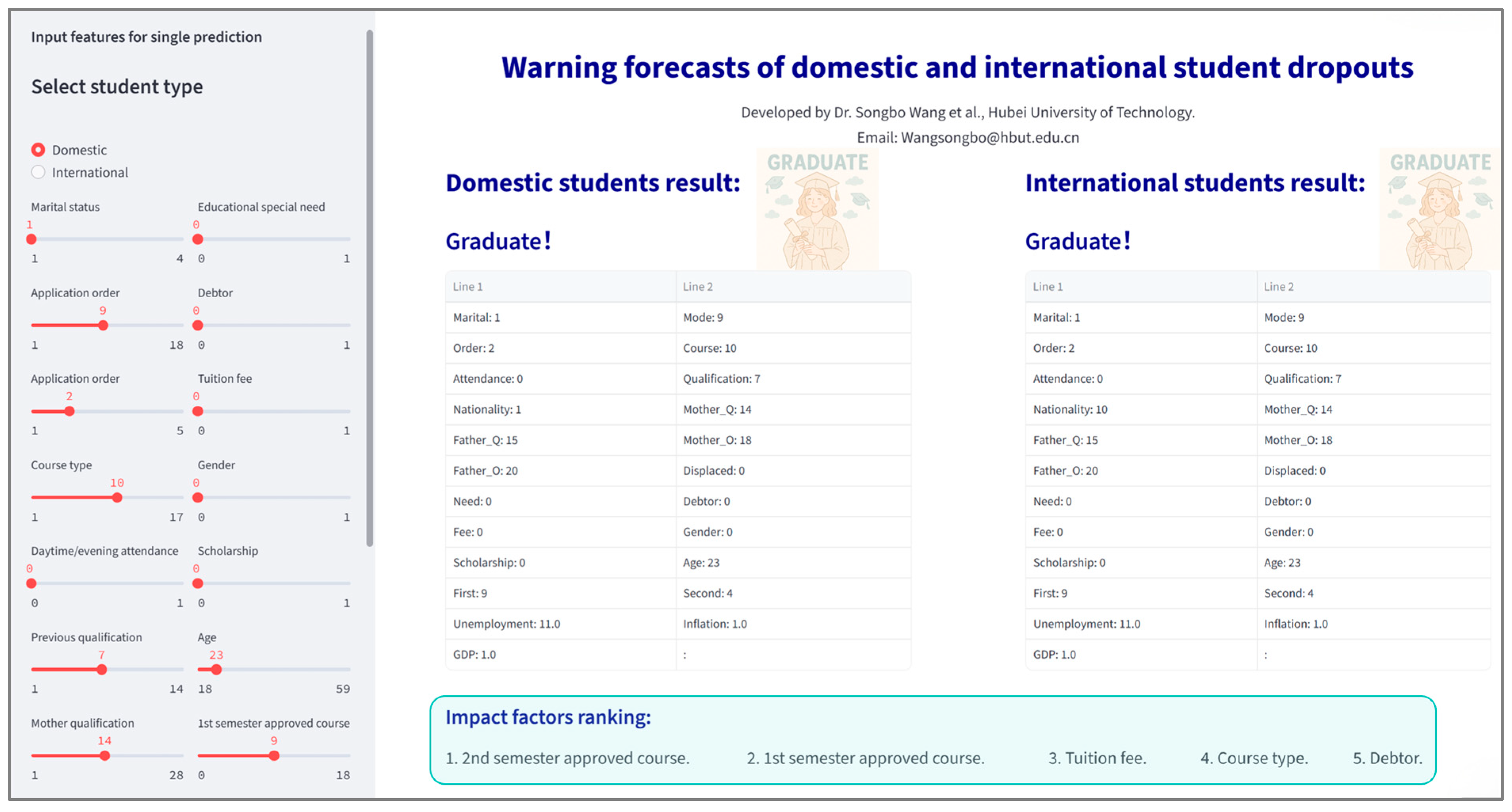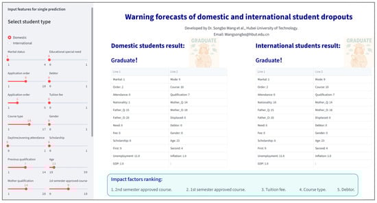As illustrated in Figure 10, the interface features adjustable slider controls (left panel) for parameter input. Users modify these sliders within ranges reflecting the dataset scope (Section 3), and the integrated models generate real-time dropout predictions.