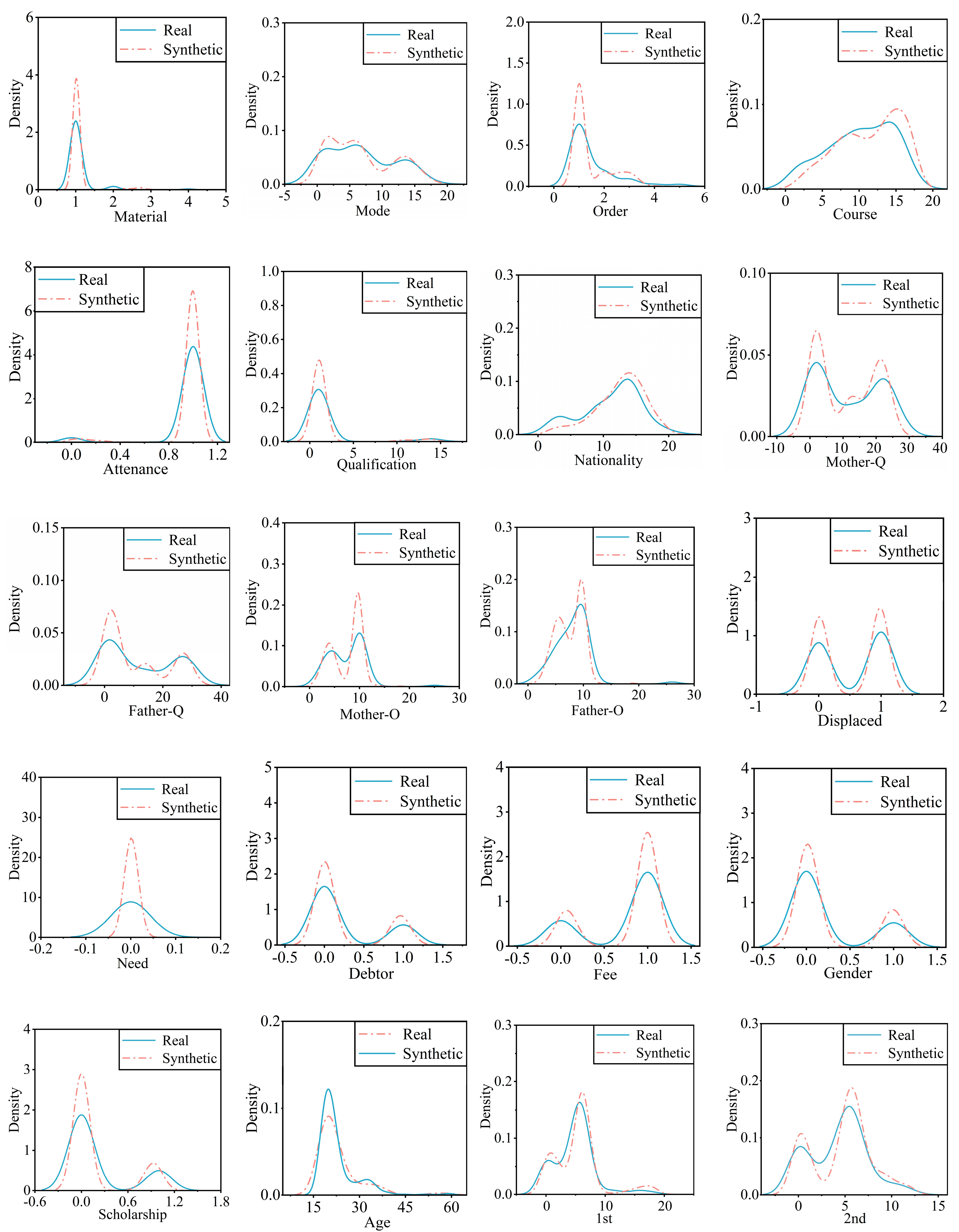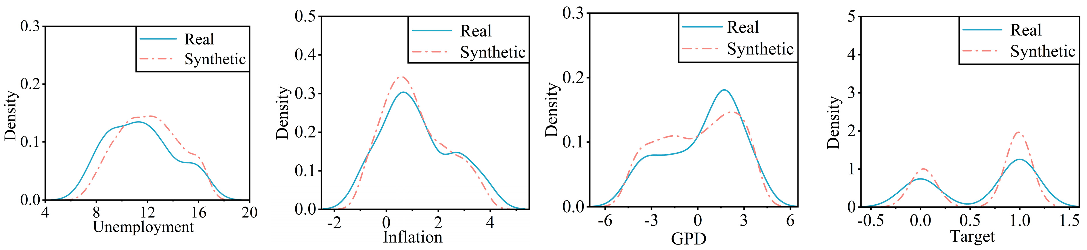 Figure 2 compares the density distributions of the real and synthetic datasets, showing that the synthetic data closely follows the distribution of the real data across all variables, thereby confirming that CTGAN has effectively learned the underlying patterns. Notably, the proportions of discontinuous target outputs are almost identical in both datasets.