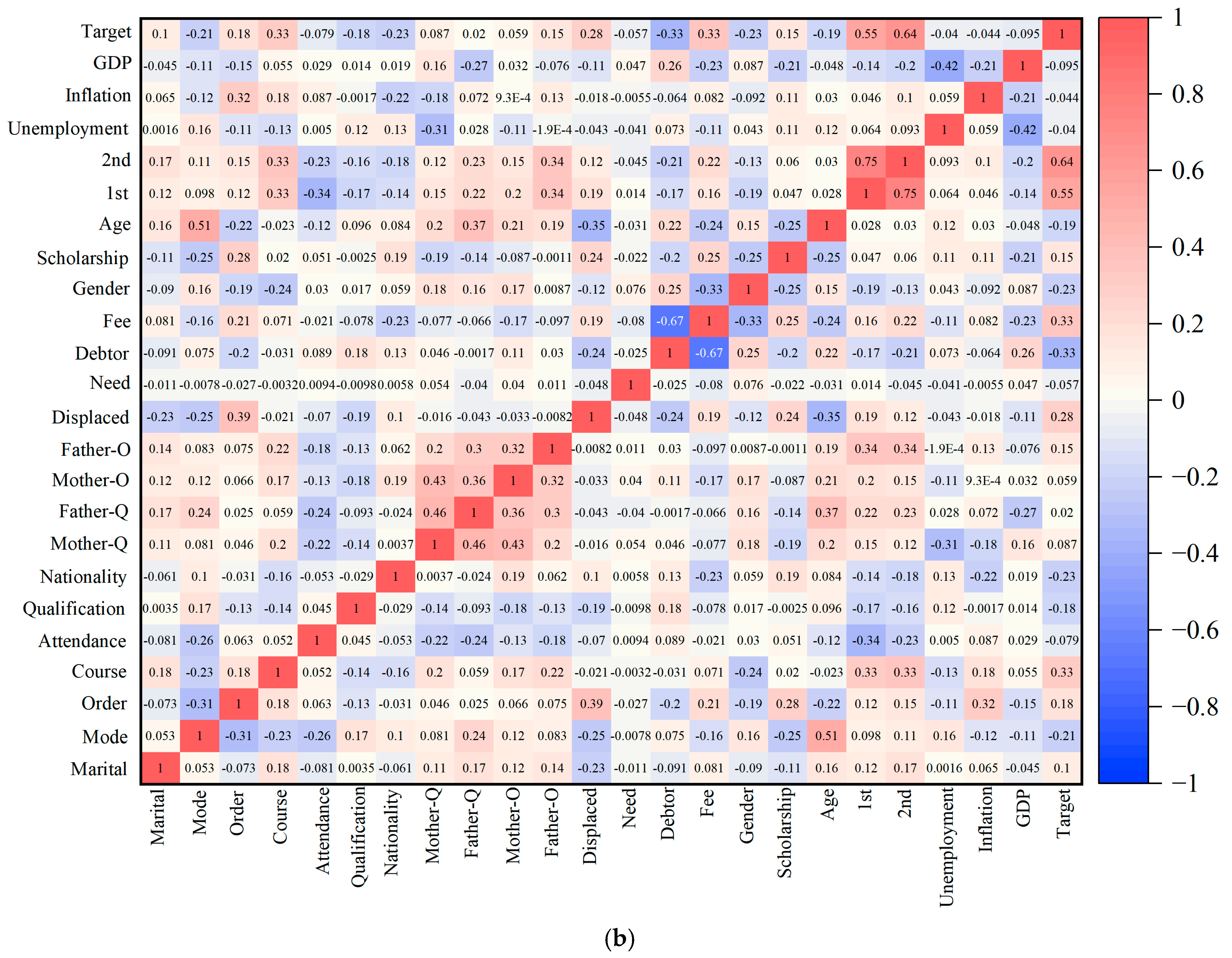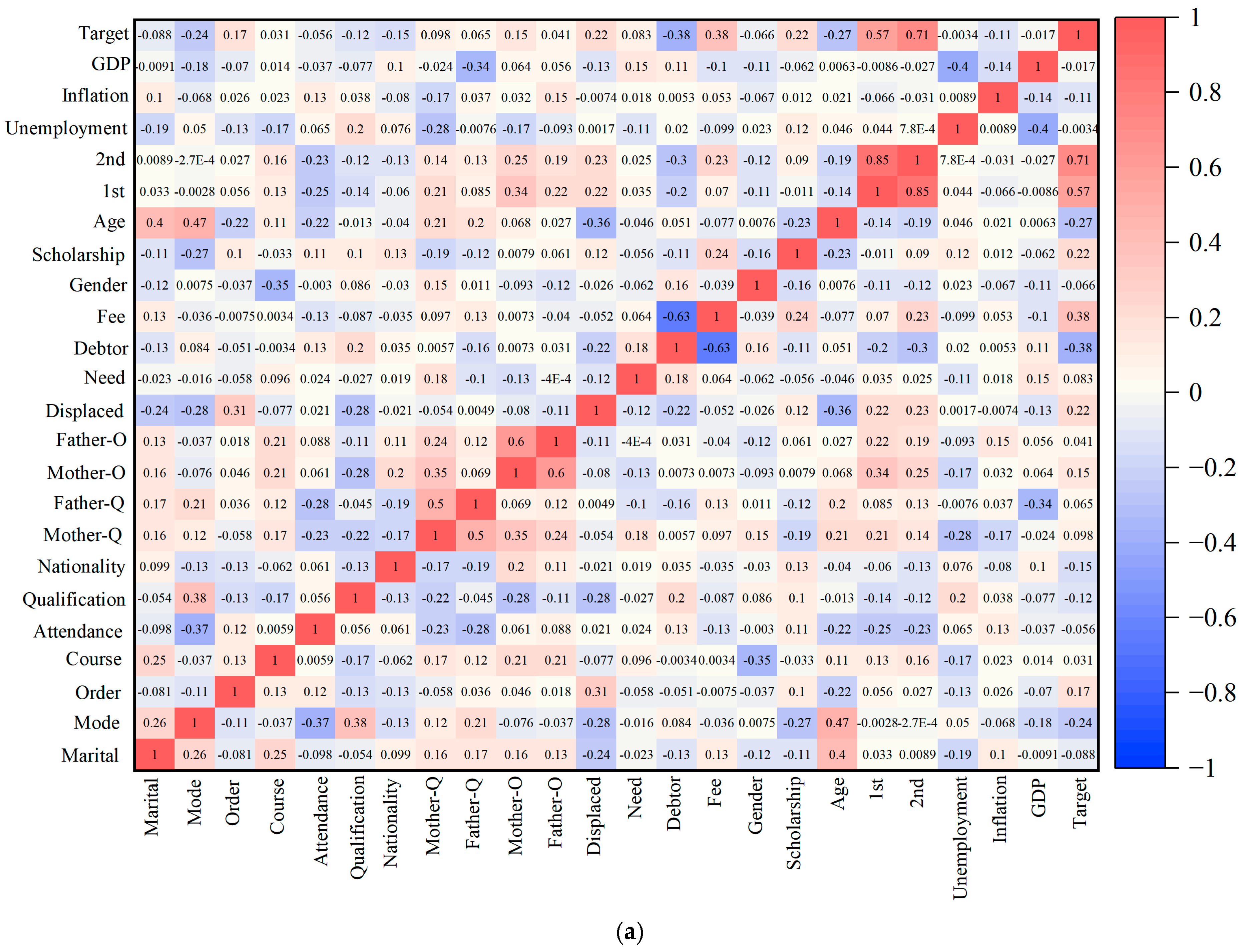 Figure 3 presents correlation matrices for both datasets. The Pearson correlation coefficient (ρ) ranges from −1 to 1, indicating strong positive (near 1), strong negative (near −1), or weak/no linear correlation (near 0). Key relationships, such as those between the Target and the 1st/2nd semester approved courses, show strong correlations (ρ > 0.55).