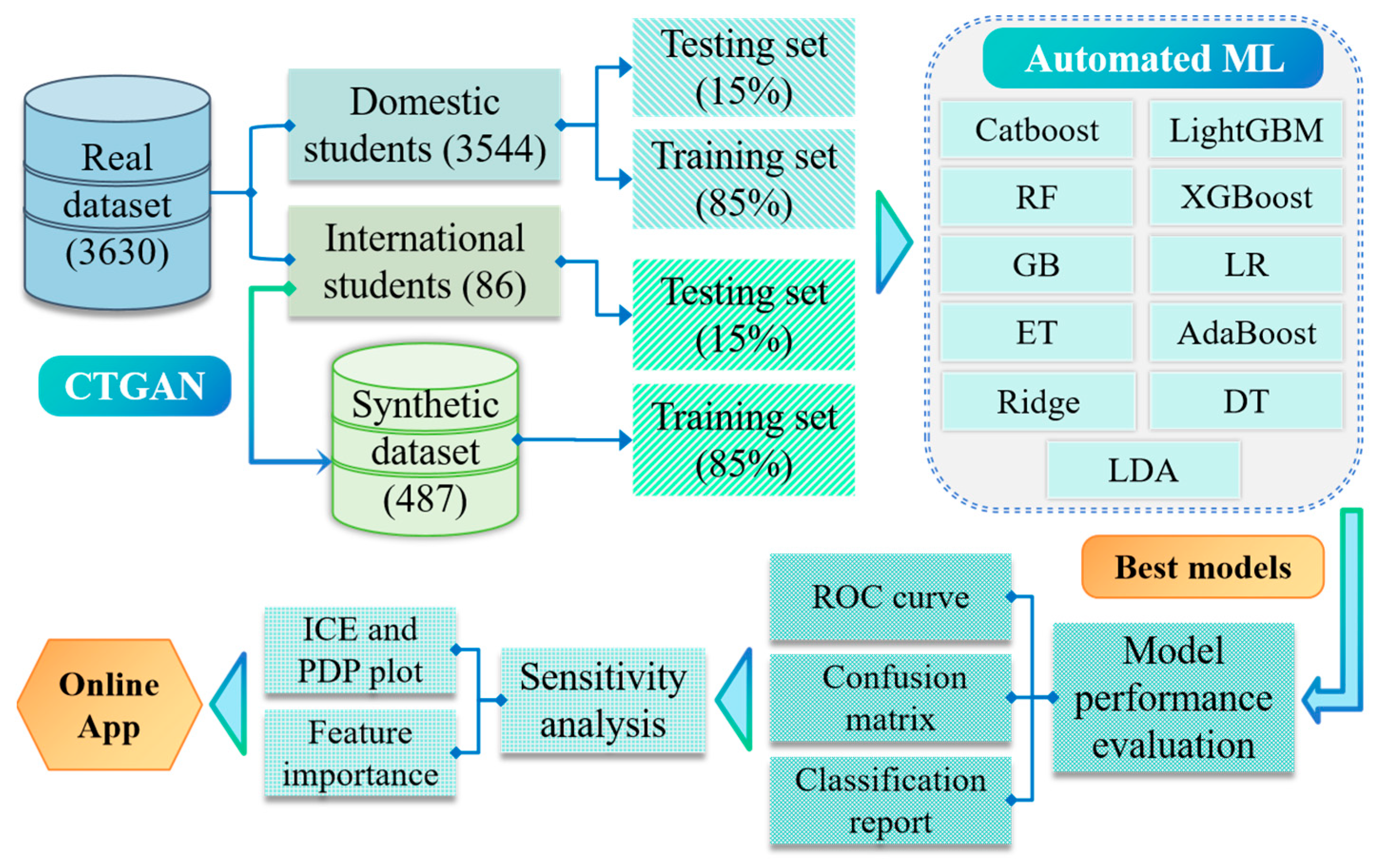 Classification algorithms were applied using an 85% training and 15% testing split, as illustrated in Figure 4. The synthetic dataset served exclusively as the training set for the international student model, resulting in a validation strategy of cross-validation on synthetic data and a single test on real data. The 10-fold cross-validation approach maximized training data utilization and mitigated overfitting risks. Additionally, a real data comparison model is introduced in the CTGAN model for international students, enabling validation of the results with actual data.