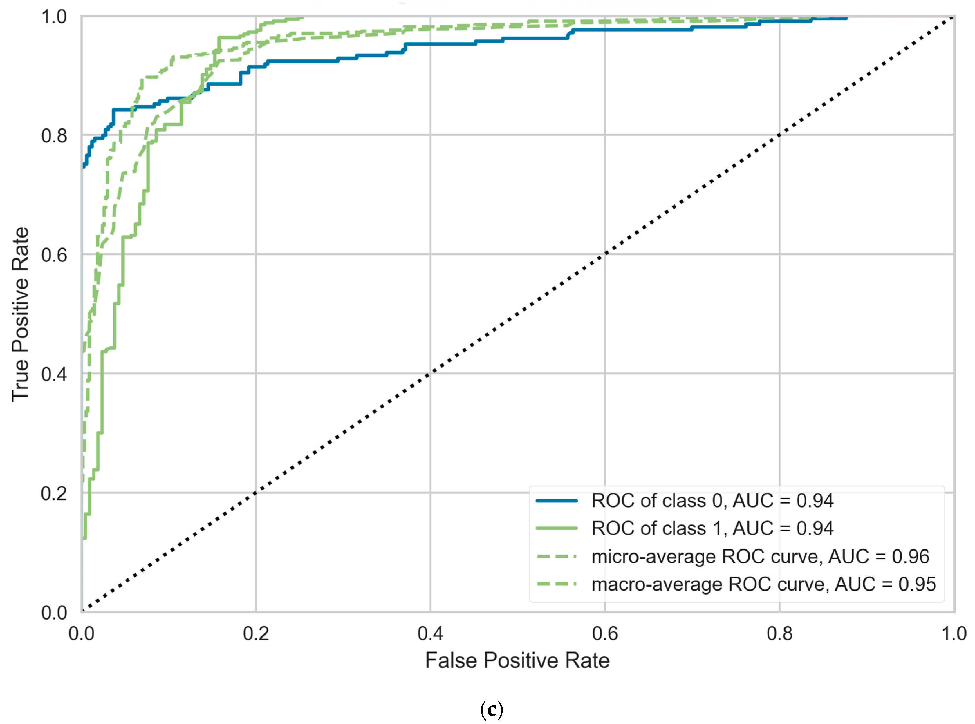 Receiver operating characteristic curve for the constructed models. (a) Domestic student forecasting model. (b) International student forecasting model based on real data. (c) International student forecasting model based on synthetic data.