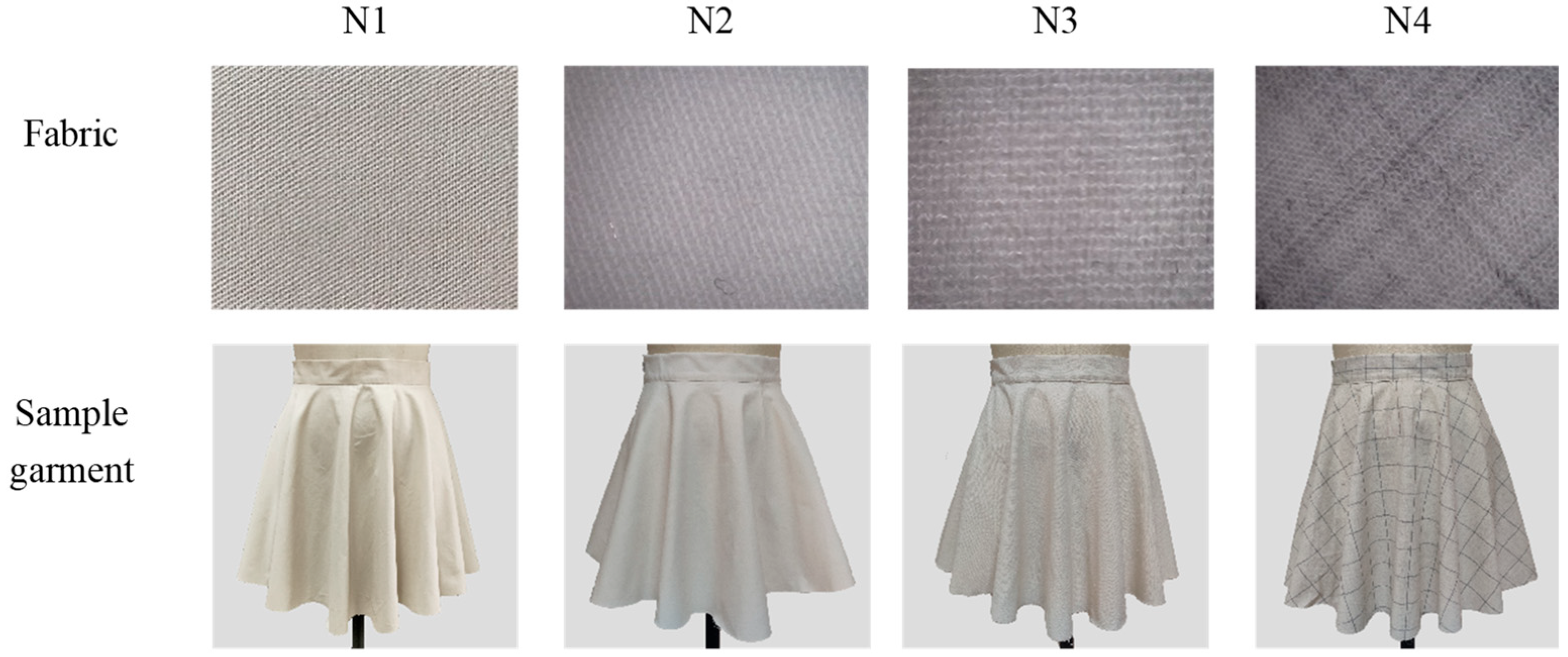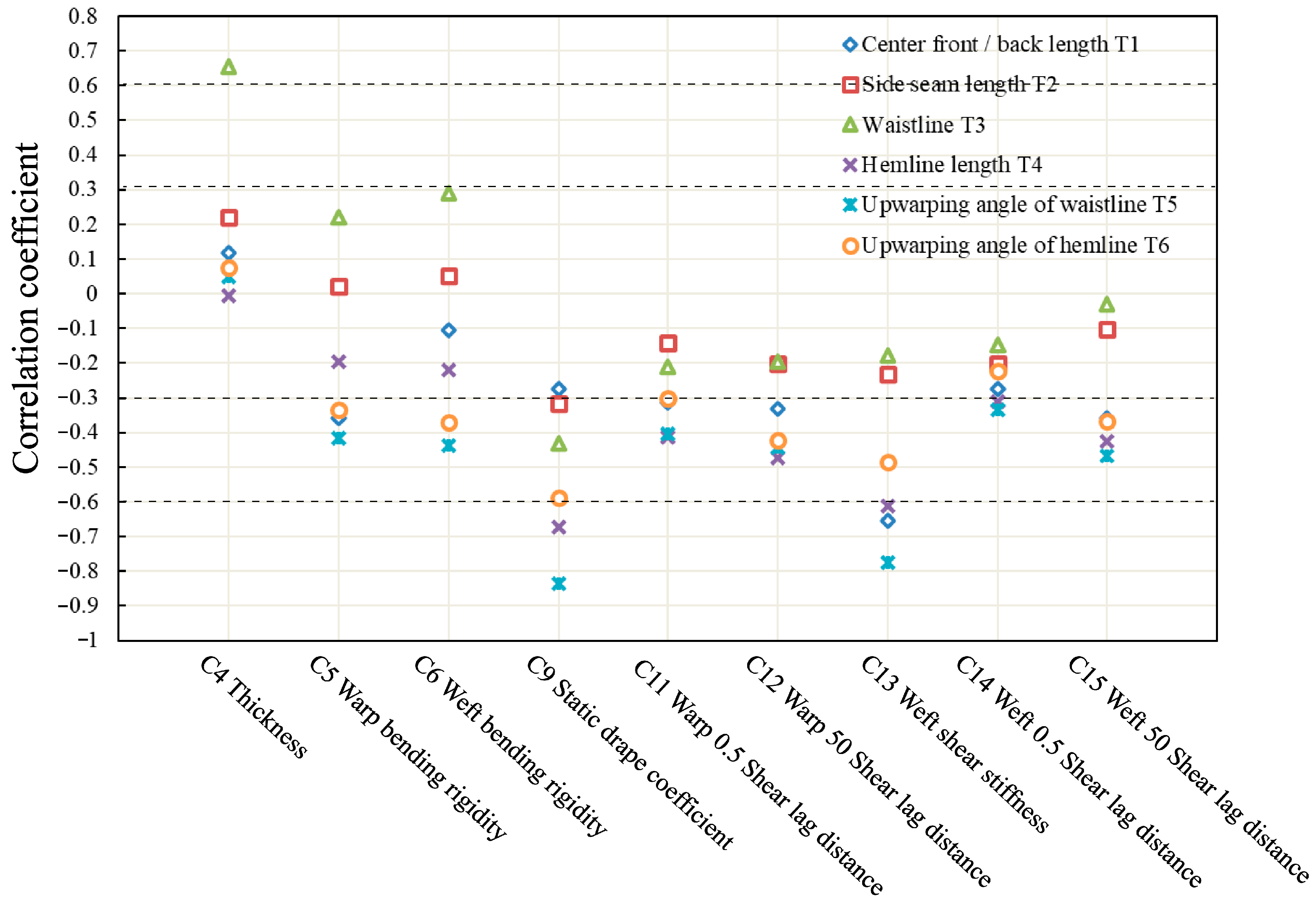 - Principal component analysis was applied to reduce dimensionality, and correlation analysis was conducted. It was found that the pattern dimension was primarily influenced by parameters such as thickness, bending rigidity, drapability, and shear performance.