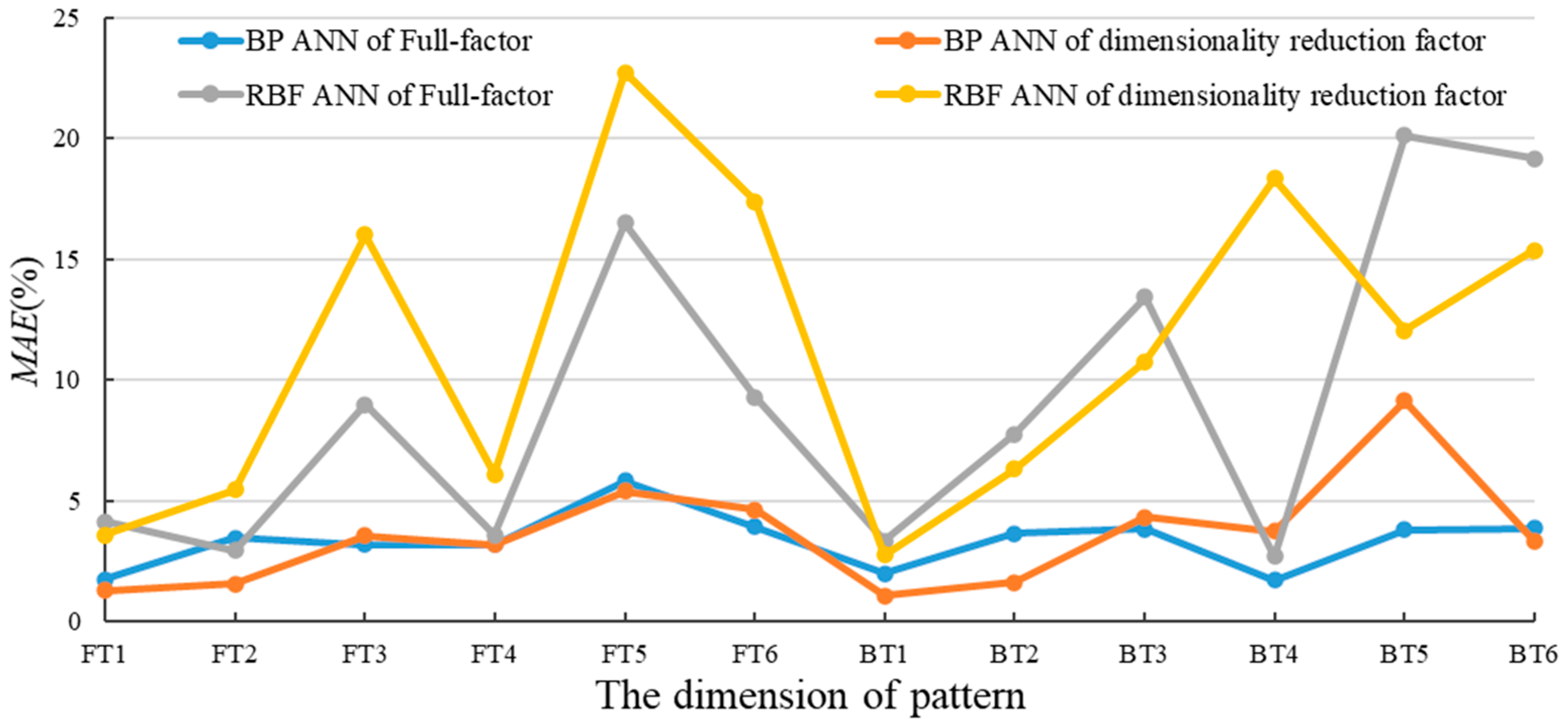 - Compared with the RBF ANN method, the BP ANN model for the dimension reduction factor achieved an impressive average prediction accuracy of 96.44%. The full-factor BP ANN model demonstrated the most accurate predictions, with an average accuracy of 96.67%. However, the prediction accuracy of the RBF ANN model was comparatively lower, with average accuracies of 90.67% and 88.6% for the full-factor and dimension reduction factor models, respectively. This shows that the dimension reduction factor BP ANN model can replace the full factor due to the minor difference.