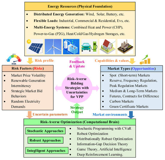 Despite the extensive literature on VPPs and bidding strategies, there is a notable lack of comprehensive reviews that systematically address risk-averse bidding for VPPs in electricity markets. This gap is critical because VPPs operate at the complex nexus of physical power systems, information networks, and financial markets. Their unique attributes—such as the ability to aggregate heterogeneous and geographically dispersed DERs, manage multi-energy flows, and navigate both technical (e.g., renewable intermittency) and market-based (e.g., price volatility) uncertainties simultaneously—demand tailored risk-management approaches. Existing reviews on VPPs often focus on architectural design or general operations [6,7,8,9,10,11,12,13,14,15], while those on bidding concentrate on traditional market participants [16,17,18,19,20], leaving a void in synthesizing the specialized strategies needed for risk-averse VPP participation.