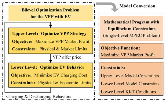 Building upon uncertainty modeling, the field has seen the development of advanced optimization frameworks that explicitly integrate risk measures into the decision-making process of EV-integrated VPPs. A prominent trend is the use of bi-level or hierarchical models to capture the strategic interaction between the VPP (leader) and EV users (followers). Specifically, as shown in Figure 2, the strategic interaction between a VPP and EV users can be modeled as a bilevel optimization problem as follows.
