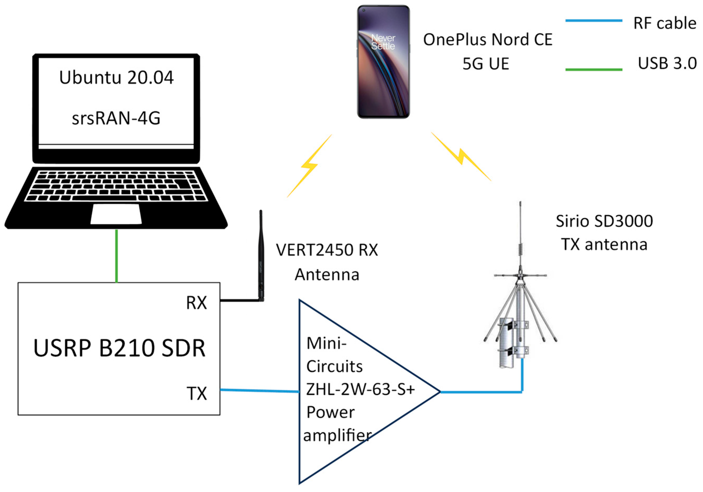 • We implemented a 4G MPN using the USRP B210 SDR (Ettus Research Ltd., Austin, TX, USA) as radio front-end and an open-source software suite (srsRAN 4G 23.11) and extended its range using an external power amplifier.
