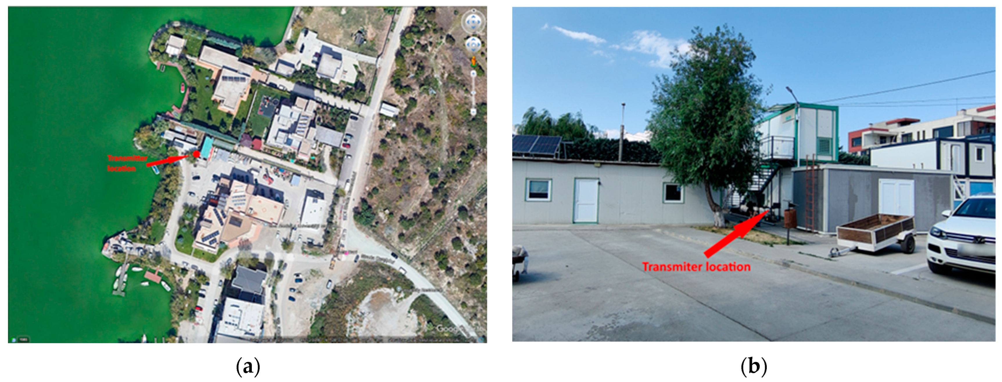 For performing the experiments, the MPN was installed in Constanta, Romania, in the Nautical Base from the Maritime University of Constanta. This area was selected as one of the goals of this research was to analyze the radio coverage of the mobile private network in the presence of several containers, similar to those used in maritime transport, which aligns with the topic of the Solid-B5G project [32] that financed this paper. The coordinates of the MPN transmit antenna are latitude 44°13’00.21” N and longitude 28°37’07.29” E. Figure 2 provides a satellite view of the region where the MPN was installed and where the field measurements were performed, captured using Google Earth Pro, along with a picture of the surroundings.