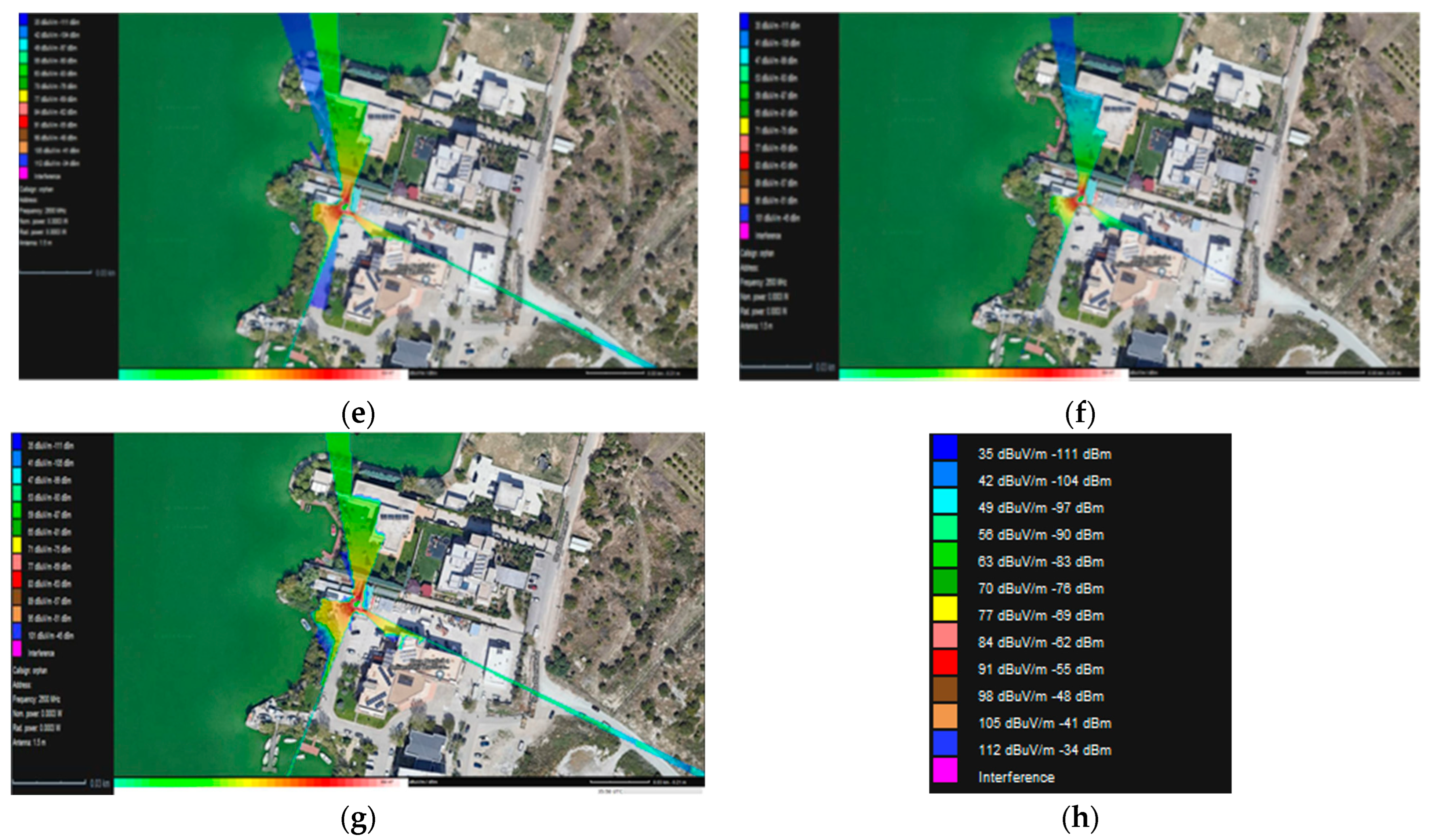 Figure 8. Estimated coverage for the MPN on the 700 MHz frequency using as propagation model: (a) ITU-R 1225; (b) ITU-R 528-3; (c) ITU-R P.2001-4; (d) ITU-R 1546-6; (e) ITU-R 525/526-11; (f) M.2412 UMa; (g) ITU-R 452-14. Subfigure (h) represents a detailed legend of the colors corresponding to the different received signal levels.