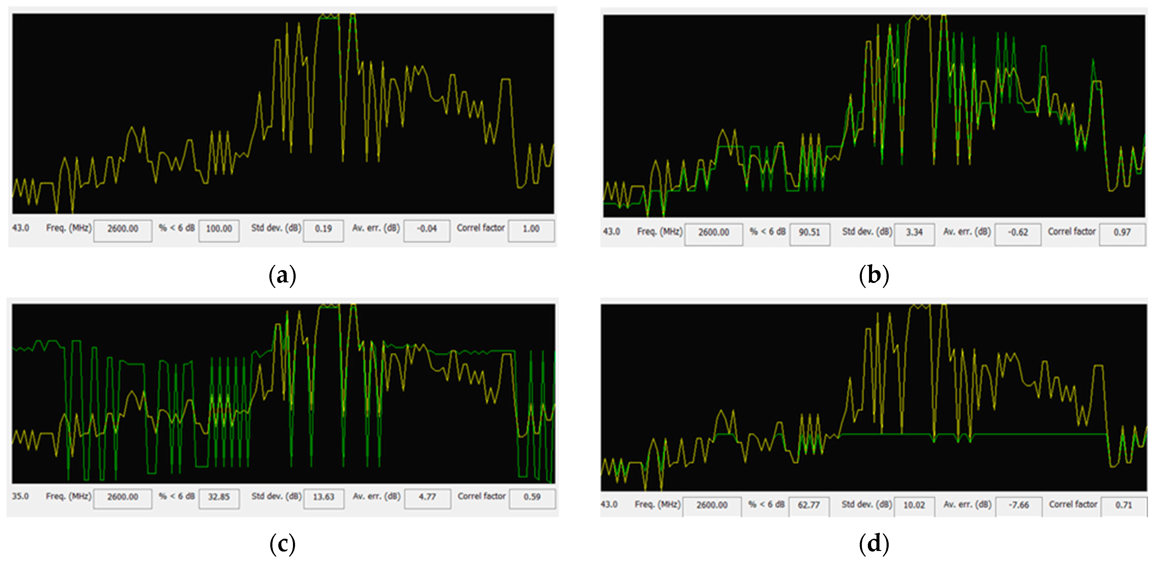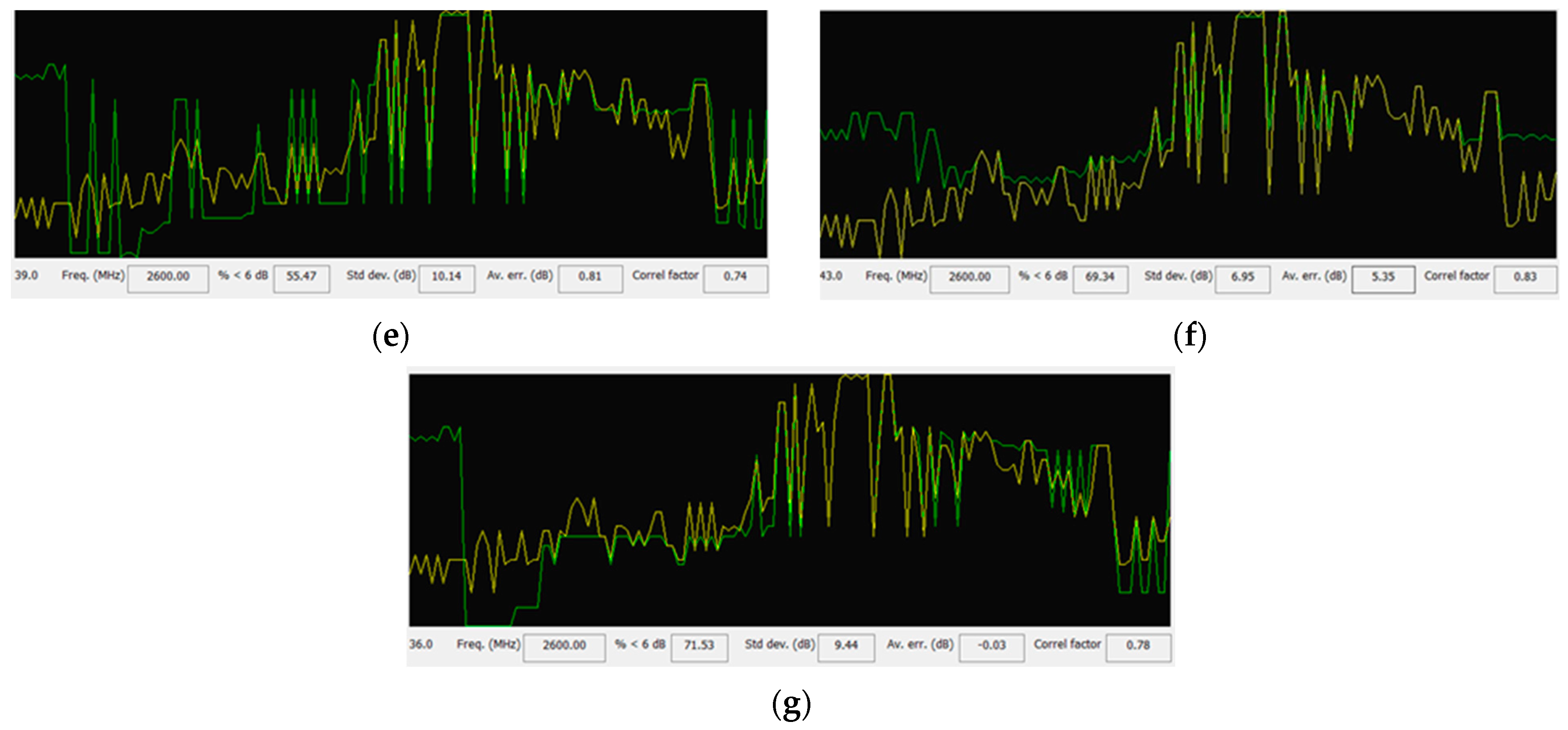 Figure 5. Correlation between the measurements (yellow) and the estimation (green) for the 2600 MHz frequency band, using as propagation model: (a) ITU-R 1225; (b) ITU-R 528-3; (c) ITU-R P.2001-4; (d) ITU-R 1546-6; (e) ITU-R 525/526-11; (f) M.2412 UMa; (g) ITU-R 452-14.