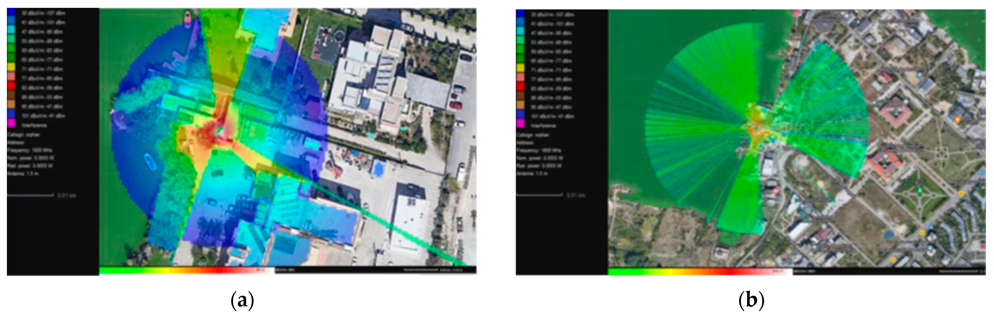• We estimated the radio coverage for the deployed network using the HTZ Communications 2024.3 radio network planning and optimization software [17] and different propagation models, both empirical and deterministic, for three different frequency bands (700 MHz, 1800 MHz, and 2600 MHz).