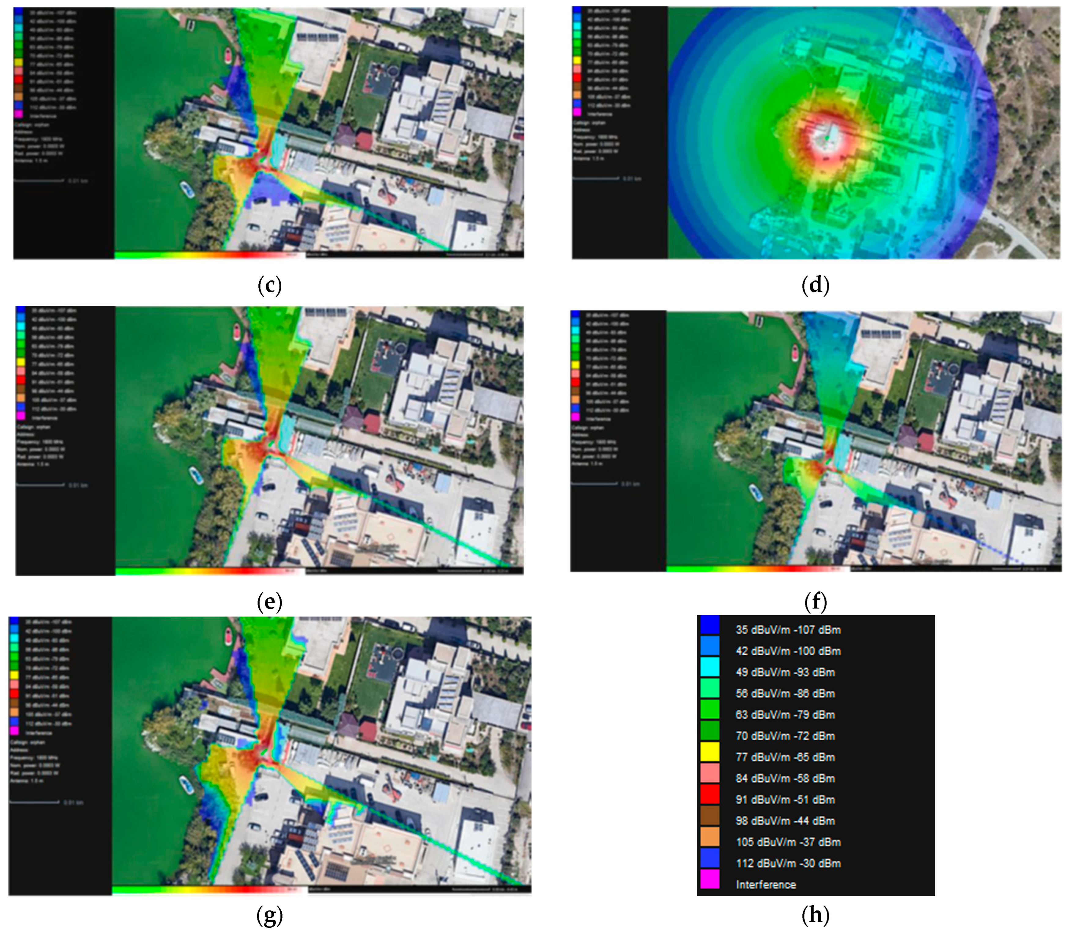 Figure 6. Estimated coverage for the MPN on the 1800 MHz frequency using as propagation model: (a) ITU-R 1225; (b) ITU-R 528-3; (c) ITU-R P.2001-4; (d) ITU-R 1546-6; (e) ITU-R 525/526-11; (f) M.2412 UMa; (g) ITU-R 452-14. Subfigure (h) represents a detailed legend of the colors corresponding to the different received signal levels.