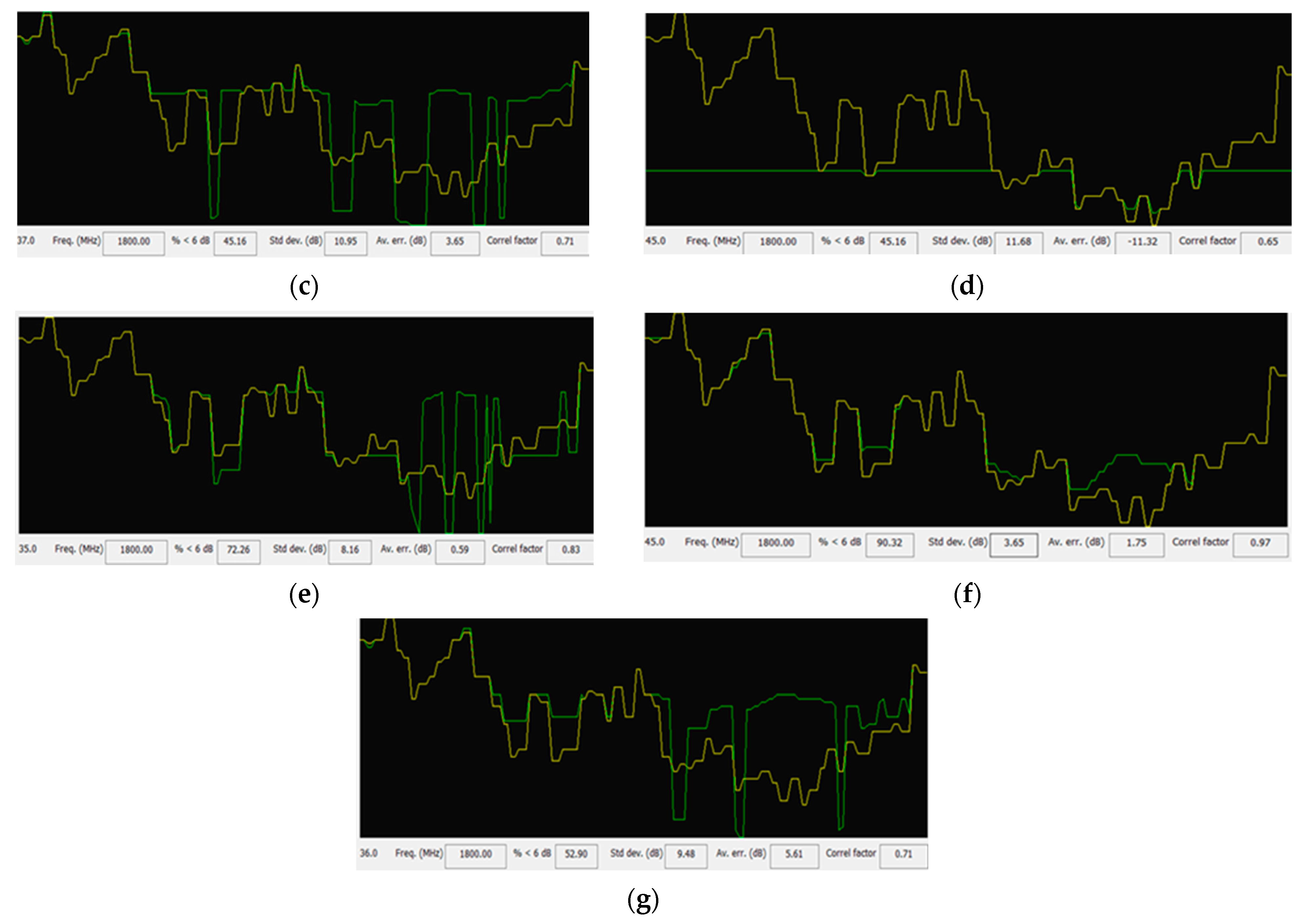 Figure 7. Correlation between the measurements (yellow) and the estimation (green) for the 1800 MHz frequency band, using as propagation model: (a) ITU-R 1225; (b) ITU-R 528-3; (c) ITU-R P.2001-4; (d) ITU-R 1546-6; (e) ITU-R 525/526-11; (f) M.2412 UMa; (g) ITU-R 452-14.