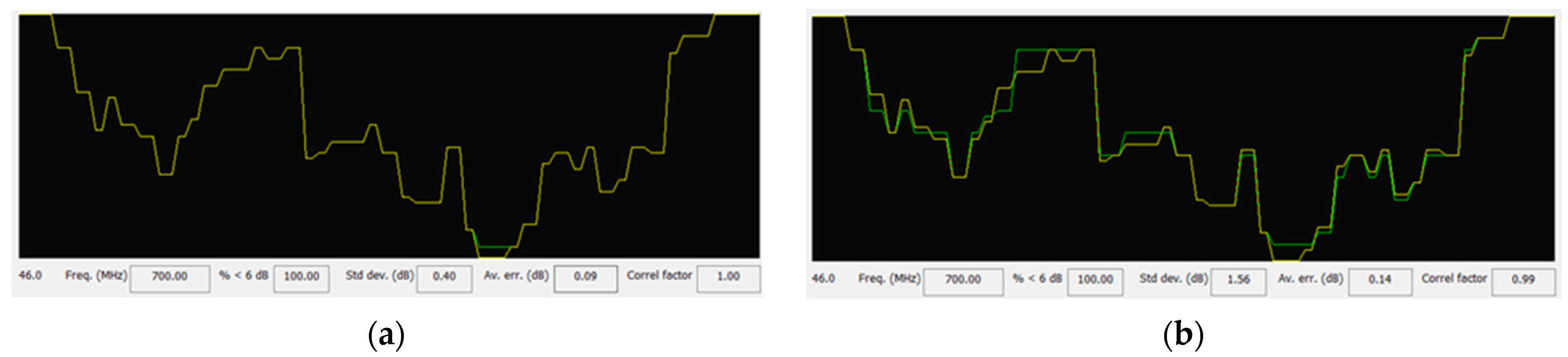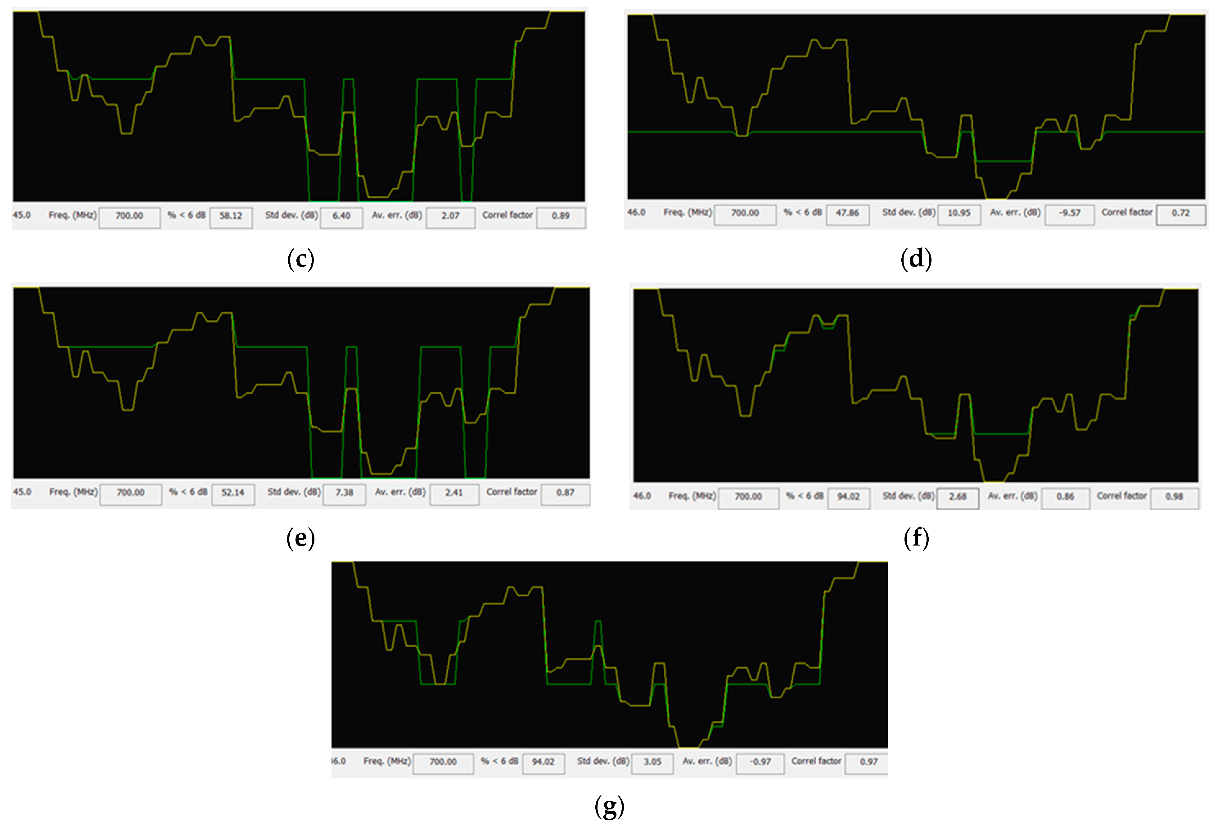 Figure 9. Correlation between the measurements (yellow) and the estimation (green) for the 700 MHz frequency band, using as propagation model: (a) ITU-R 1225; (b) ITU-R 528-3; (c) ITU-R P.2001-4; (d) ITU-R 1546-6; (e) ITU-R 525/526-11; (f) M.2412 UMa; (g) ITU-R 452-14.